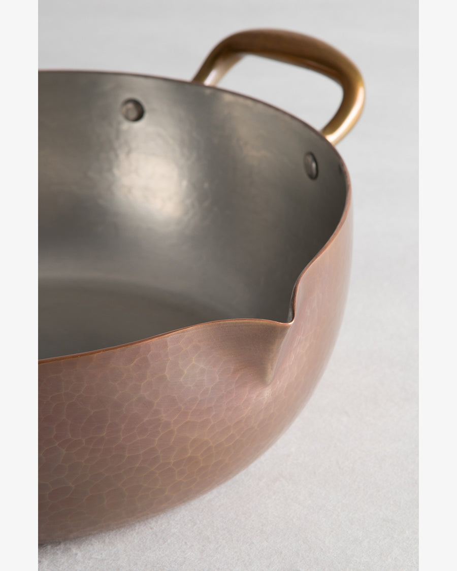 This deep hammered pot has a small built in spout in order to pour out liquids.
