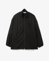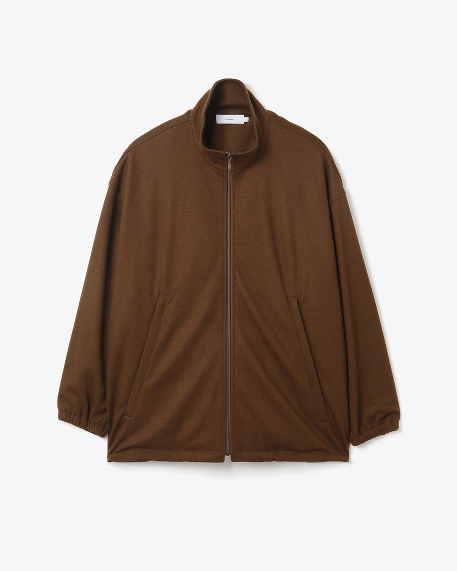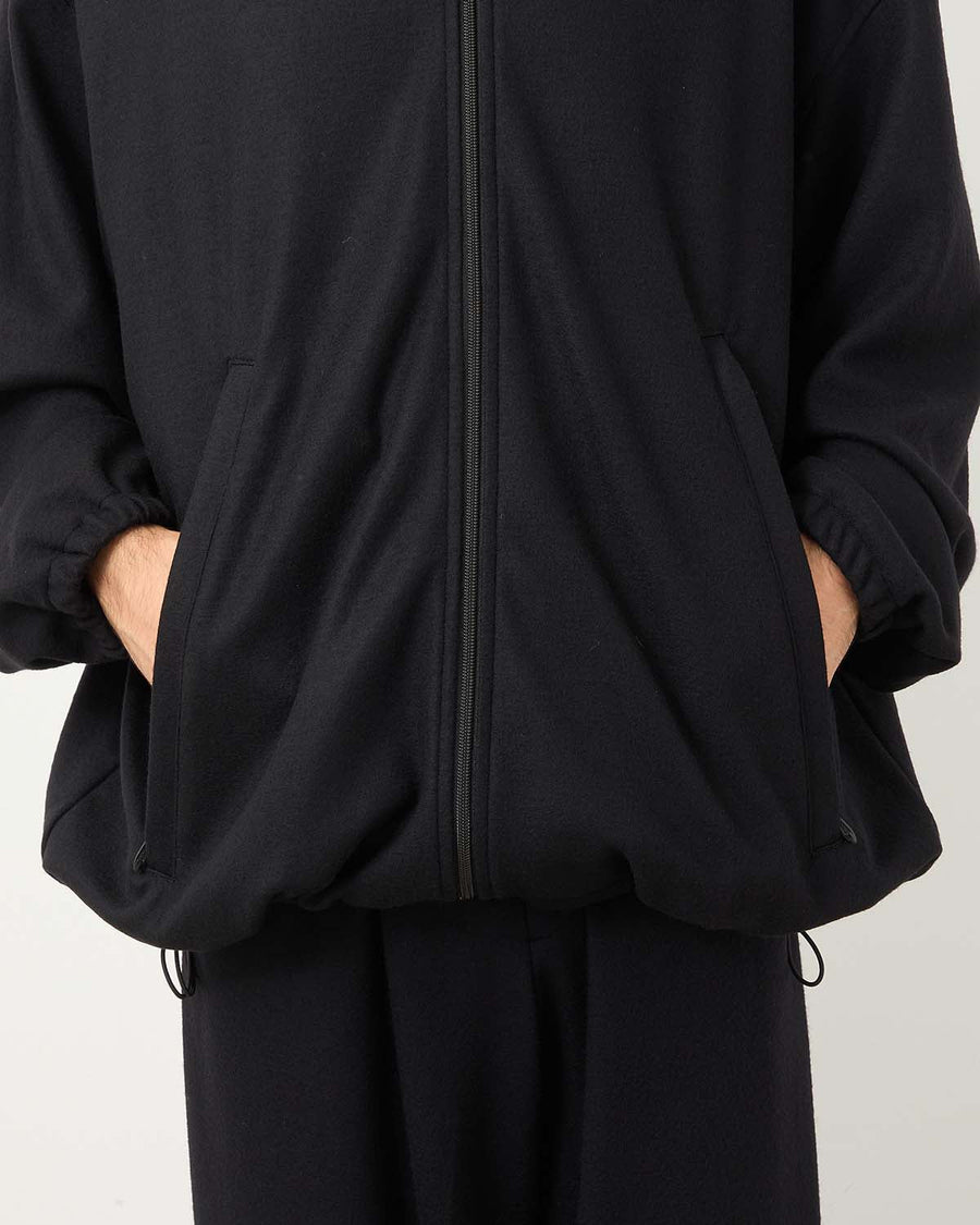 Track jacket in compressed wool smooth with cupra lining, front zipper, side pockets, drawcord hem, and hand-washable finish.