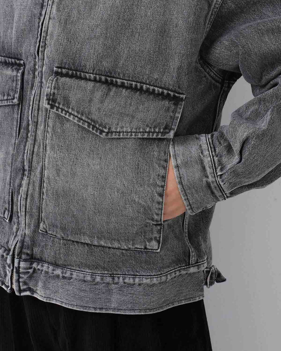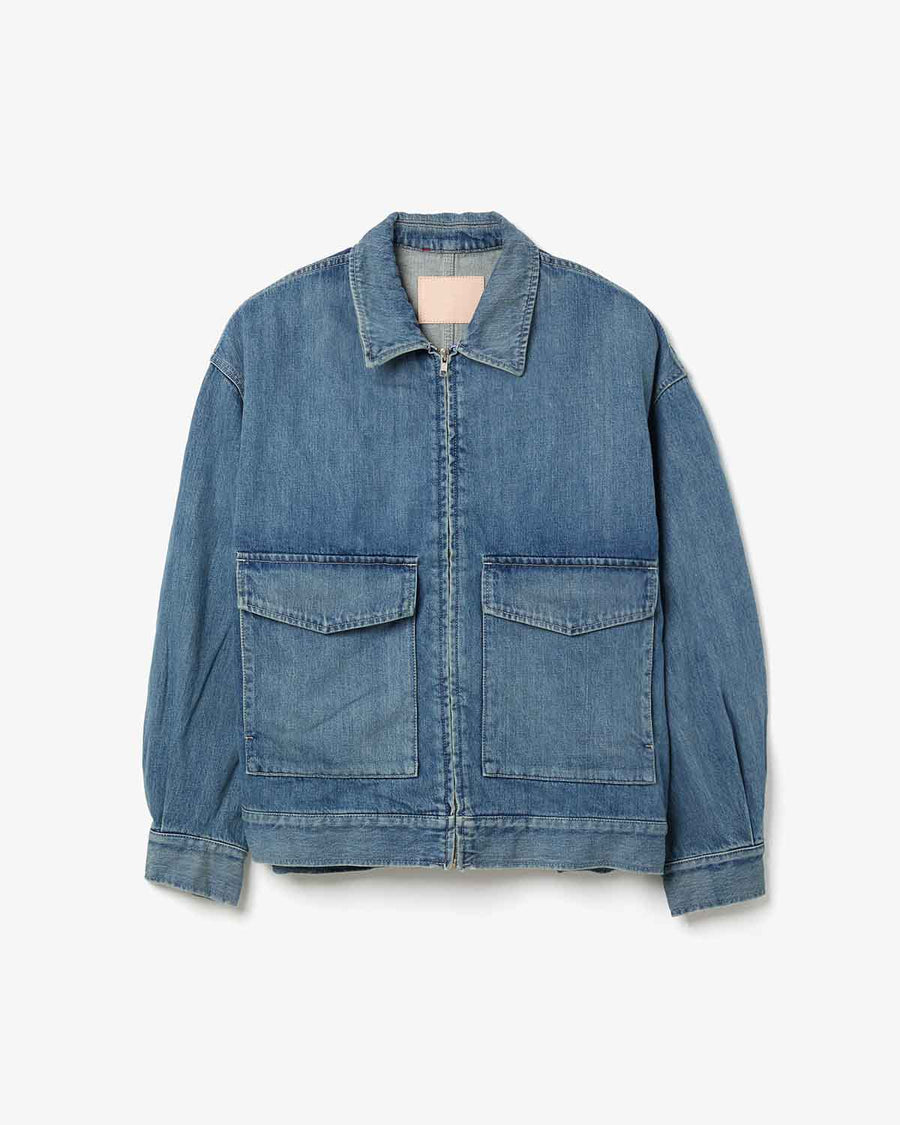 Zip-up blouson made from 13.75oz selvage denim by Cone Denim, featuring a light fade and bold drop shoulders.