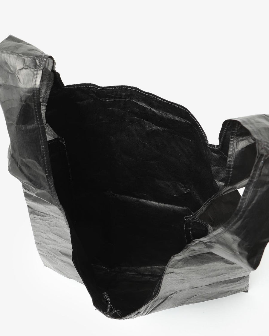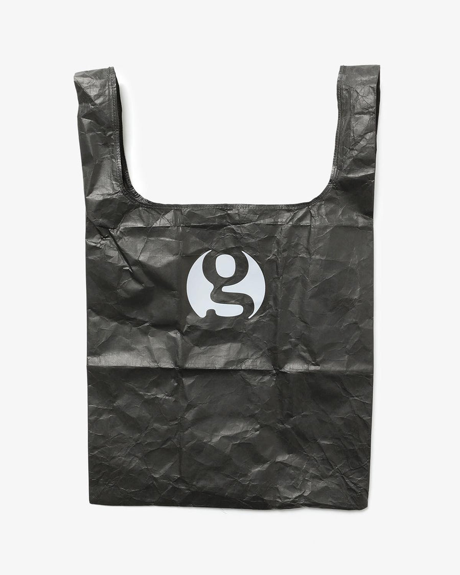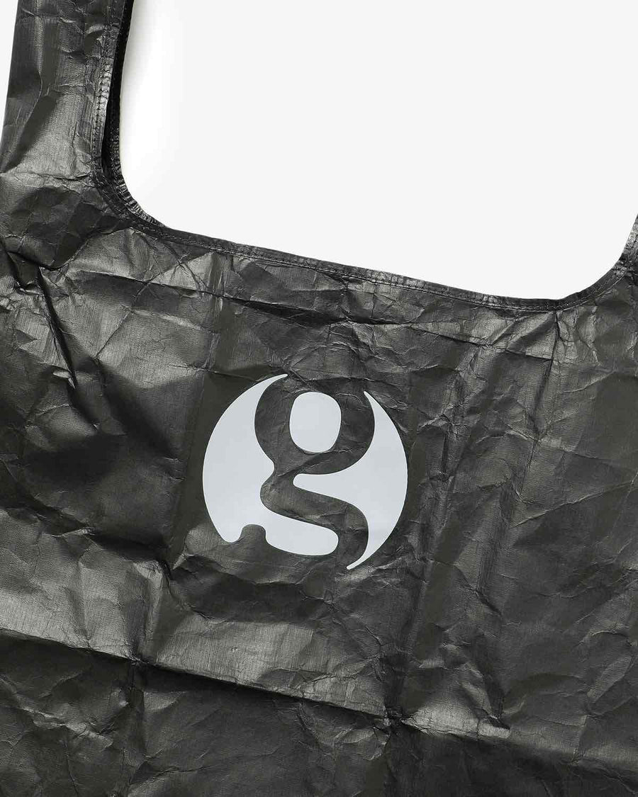 This eco-bag, made from breathable, waterproof Tyvek® with a black print, features a reflective brand logo, a brand tag, and an elastic cord for compact storage.