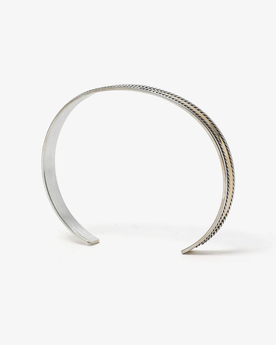 This 7mm combination bracelet features fine rope-patterned sterling silver with a matte brass center plate, showcasing meticulous domestic craftsmanship and offering a unique aging experience for both metals, perfect for wearing alone or stacked.