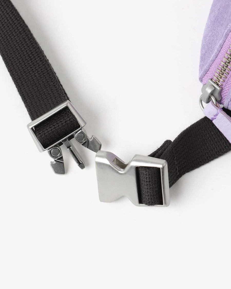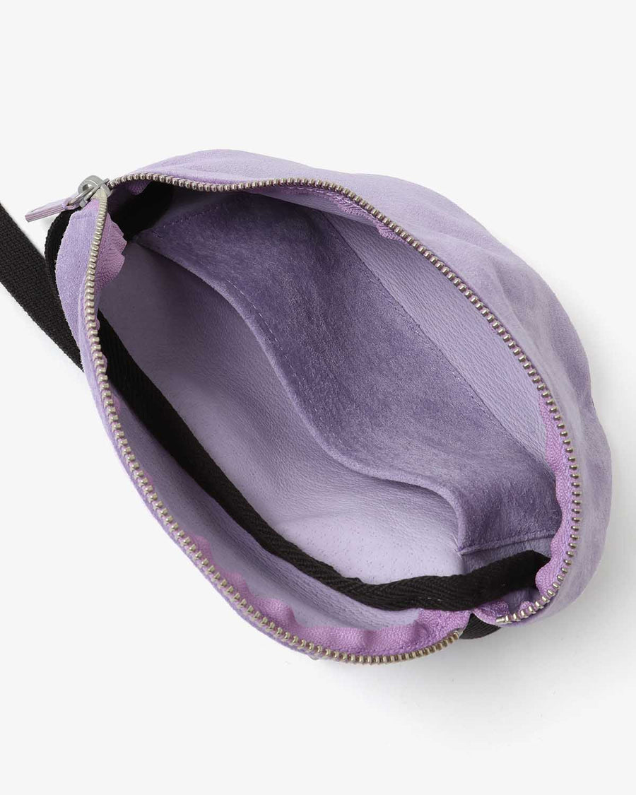 From the SPRING & SUMMER 2026 COLLECTION, this compact pig suede waist pouch in vivid lavender and yellow combines durable, lightweight pig leather with a slim, convenient design perfect for carrying everyday essentials.