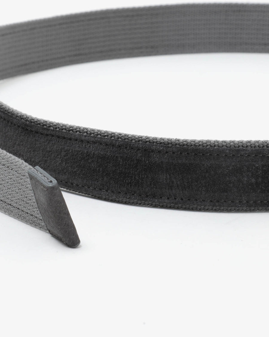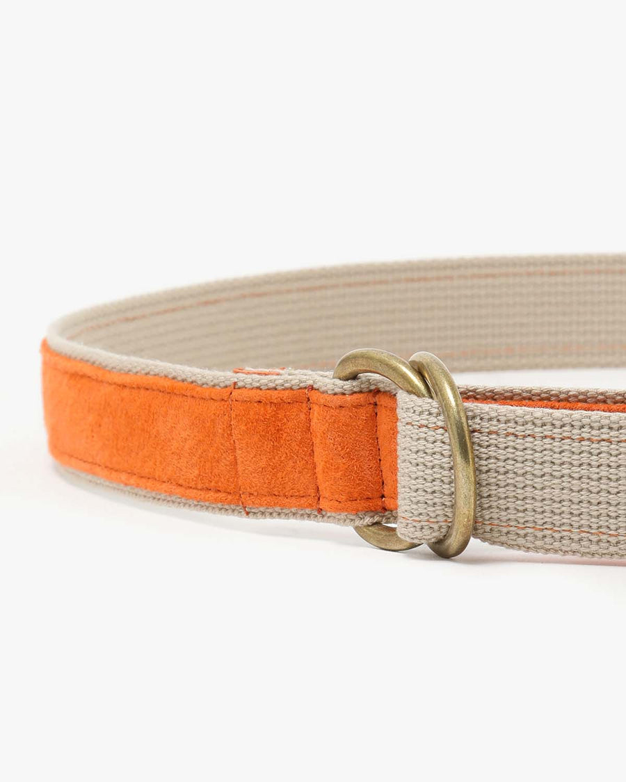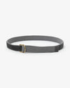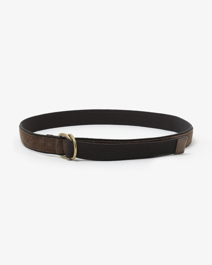 Double-ring belt with brass D-rings. Made from pig leather backed with acrylic for lightweight flexibility and durability, designed slightly long for draped wear.