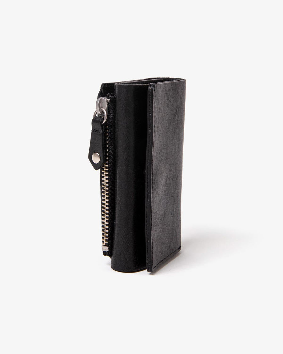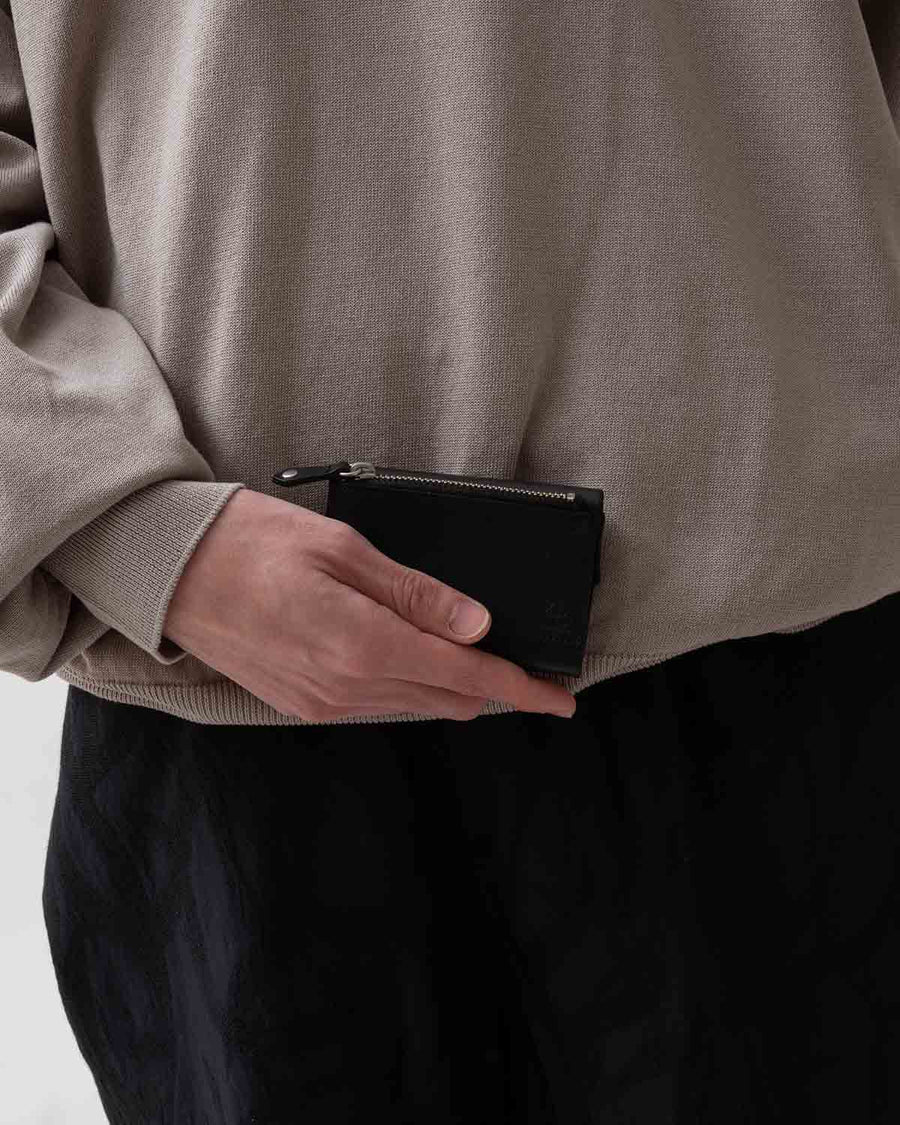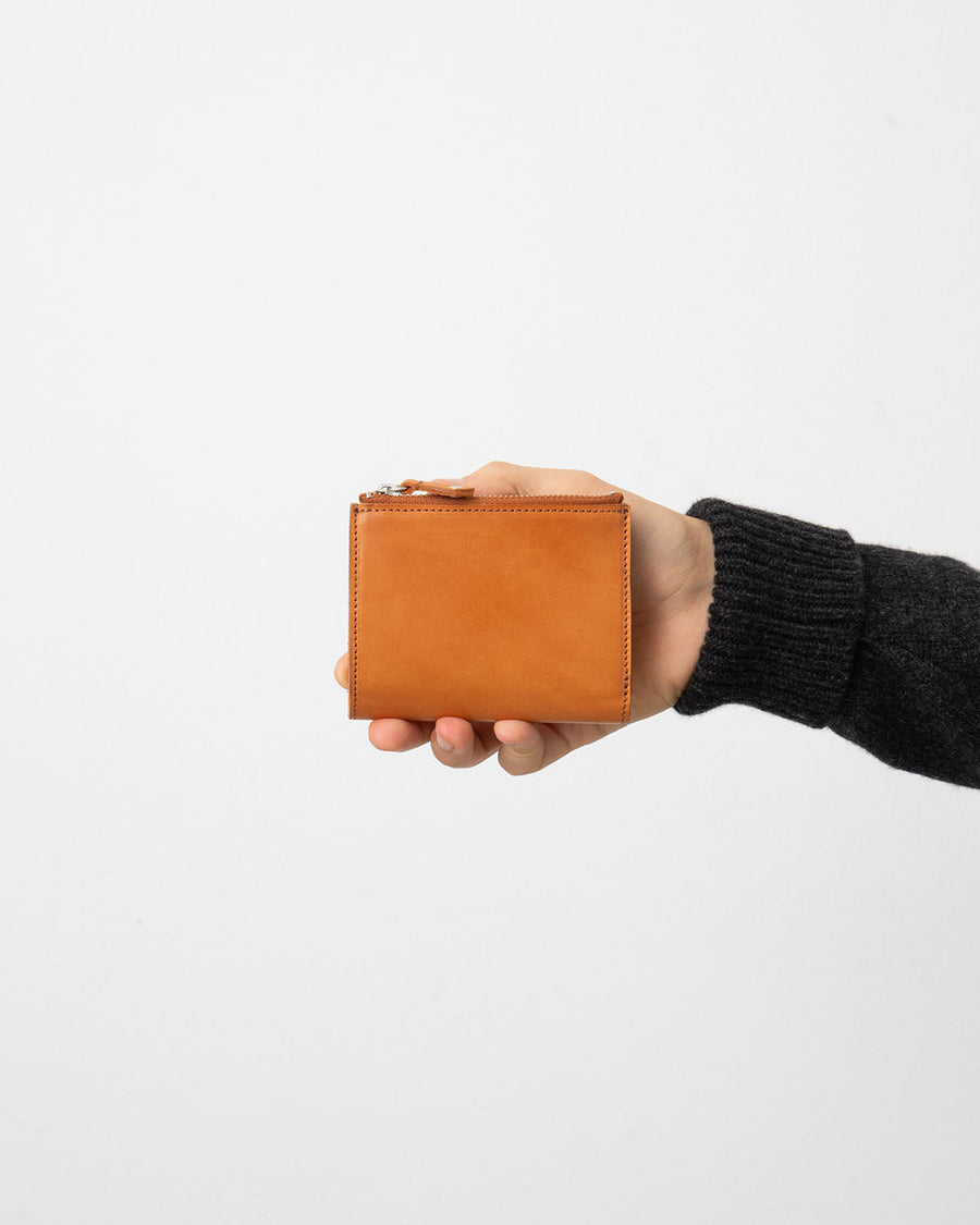 A new bi-fold wallet crafted from horse leather, featuring natural marks for a unique, supple texture that develops character over time, with a compact design offering coin, bill, and card storage.