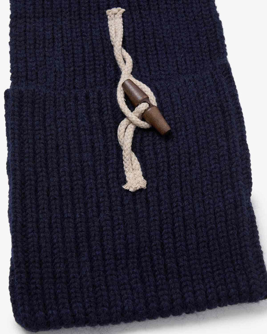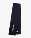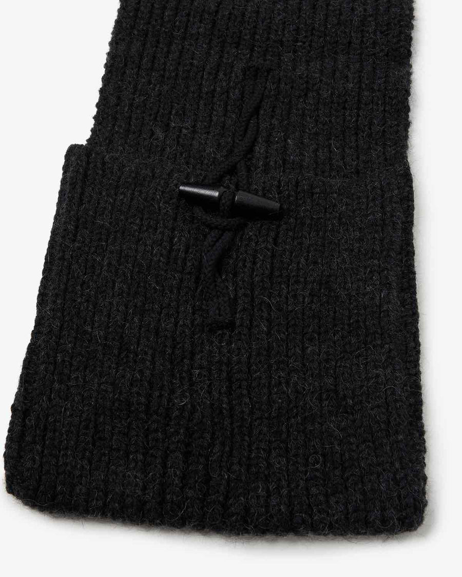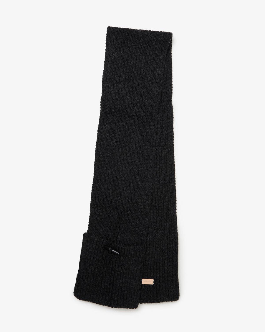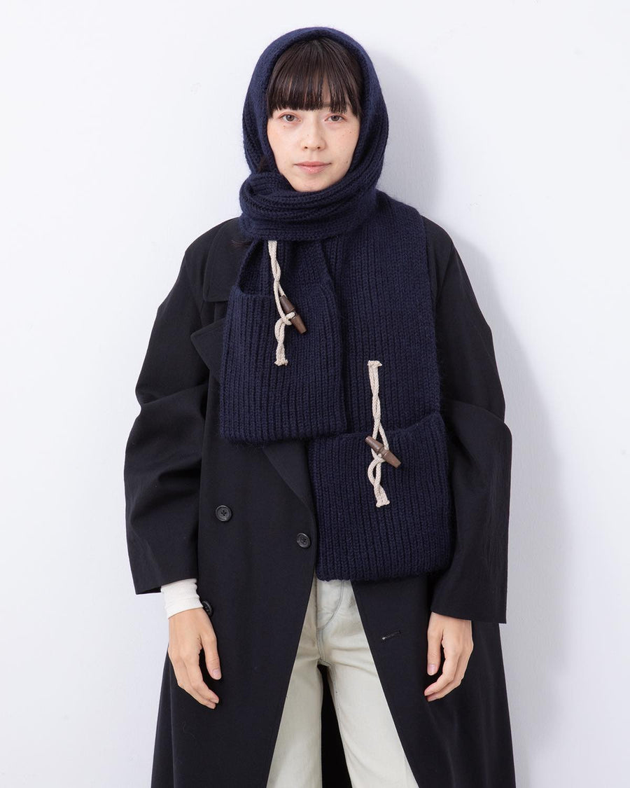 This low-gauge knitted scarf features a pocket with a toggle button, offering a warm and cozy design.