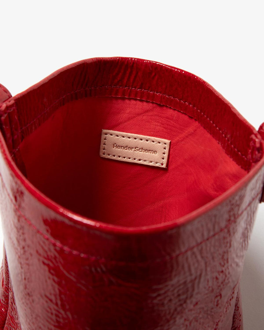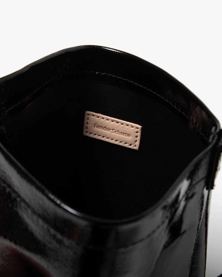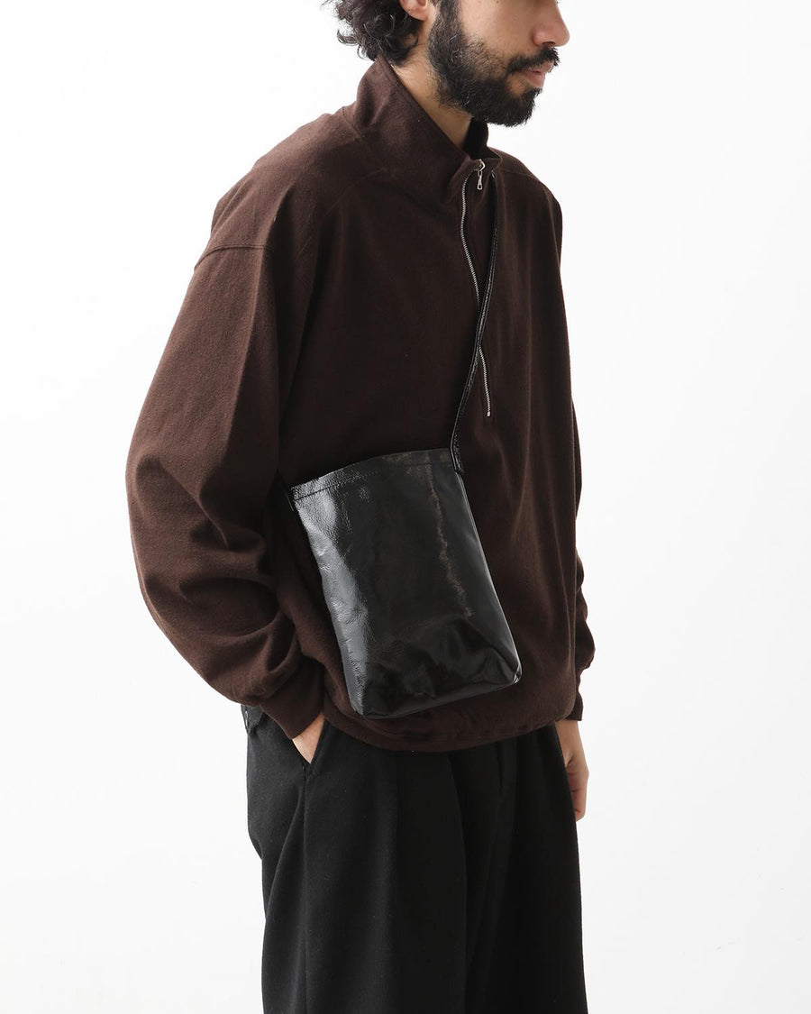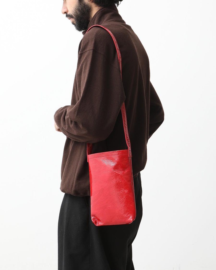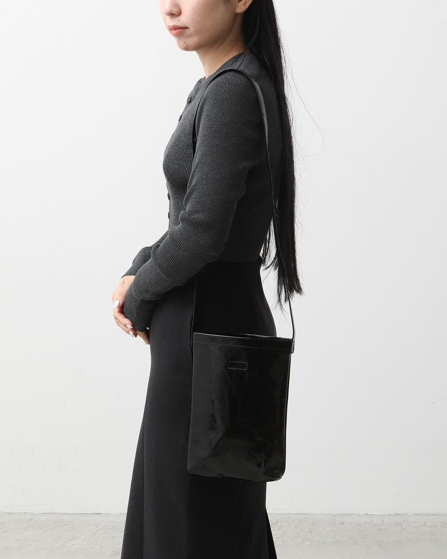 The "PATENT HORSE SHOULDER SMALL" from the "PATENT HORSE SERIES," inspired by Hender Scheme's classic bags, features patent leather laminated with polyurethane film on horse leather.