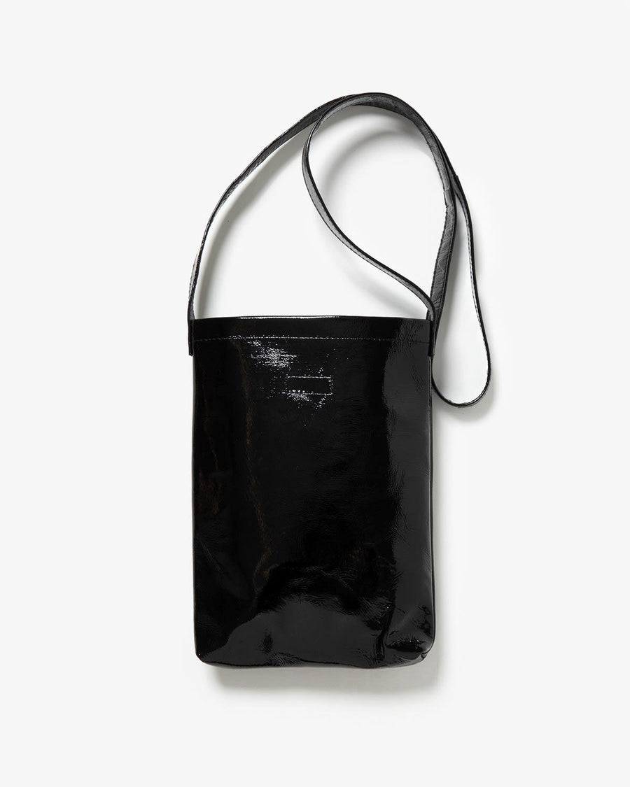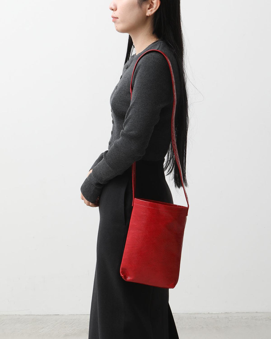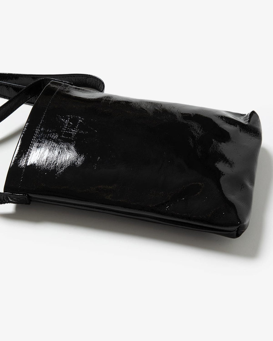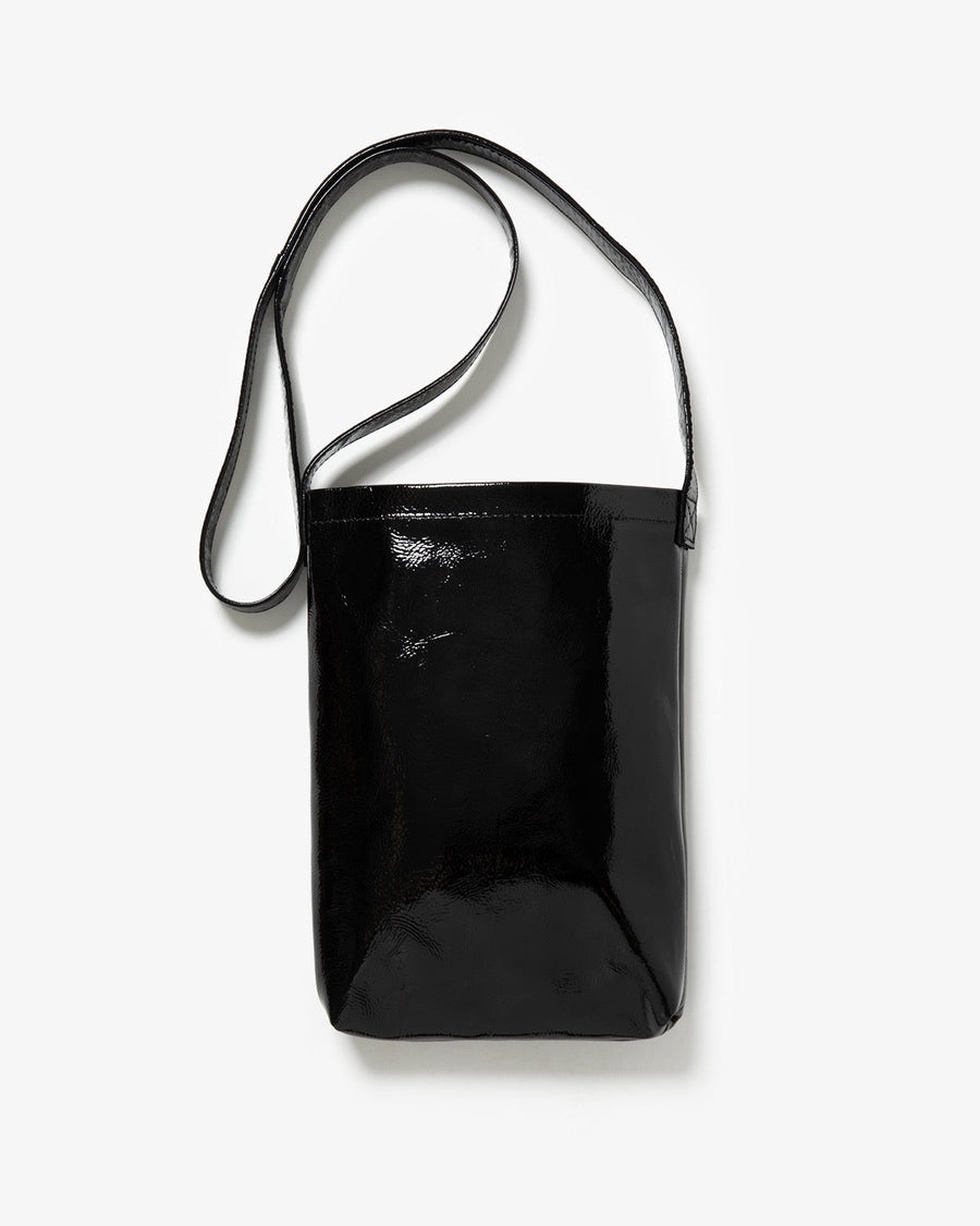 The "PATENT HORSE SHOULDER SMALL" from the "PATENT HORSE SERIES," inspired by Hender Scheme's classic bags, features patent leather laminated with polyurethane film on horse leather.