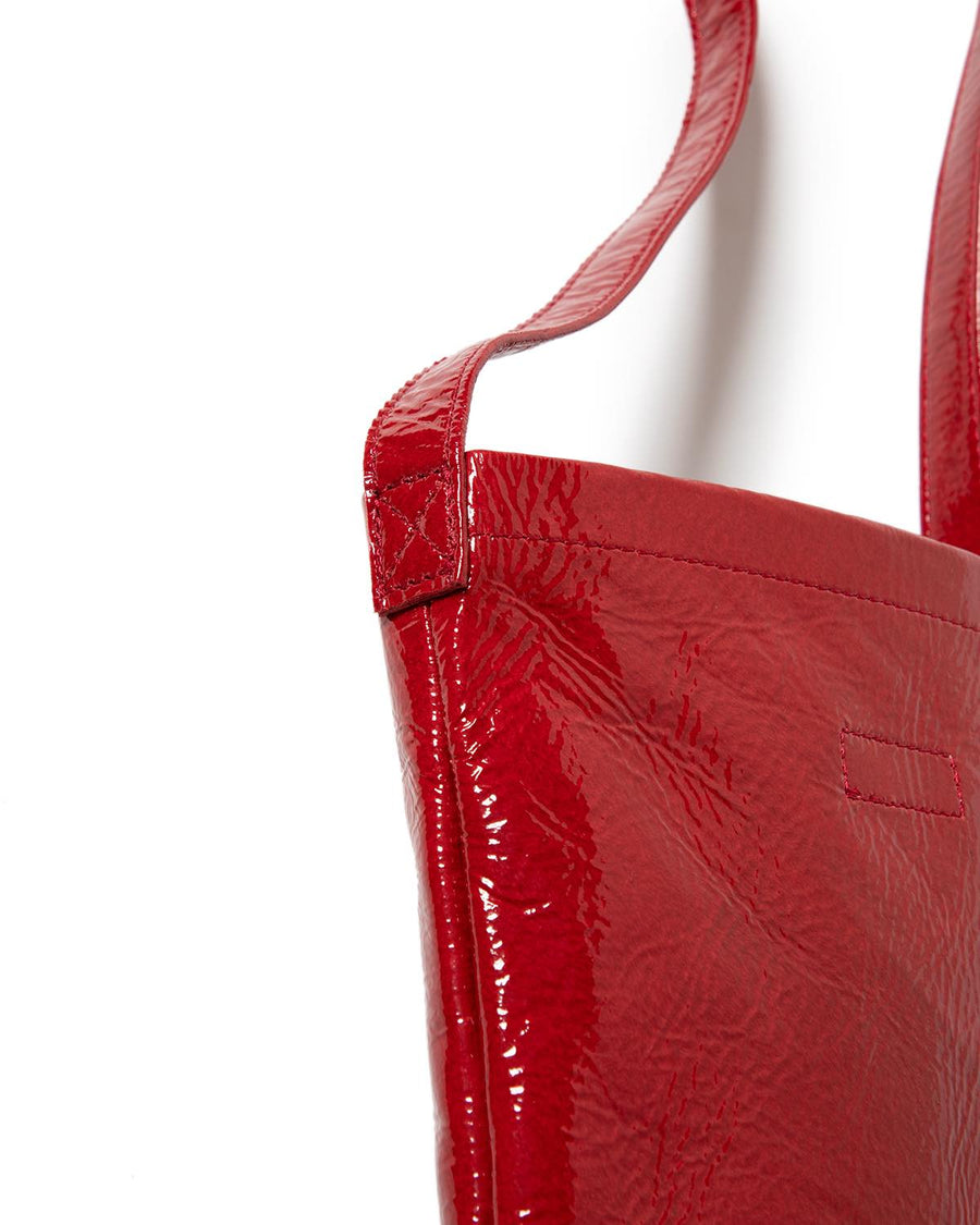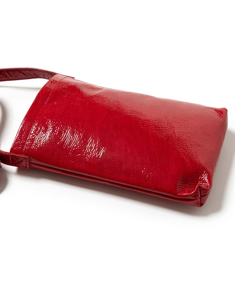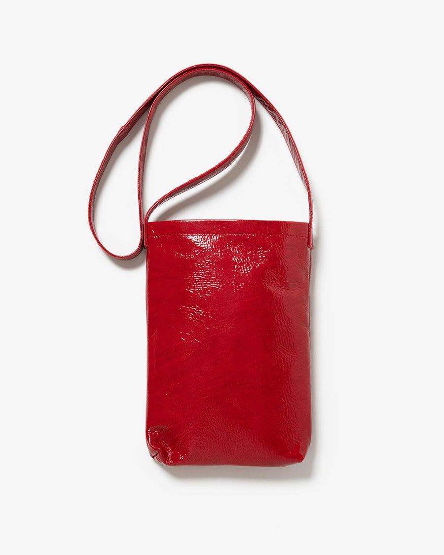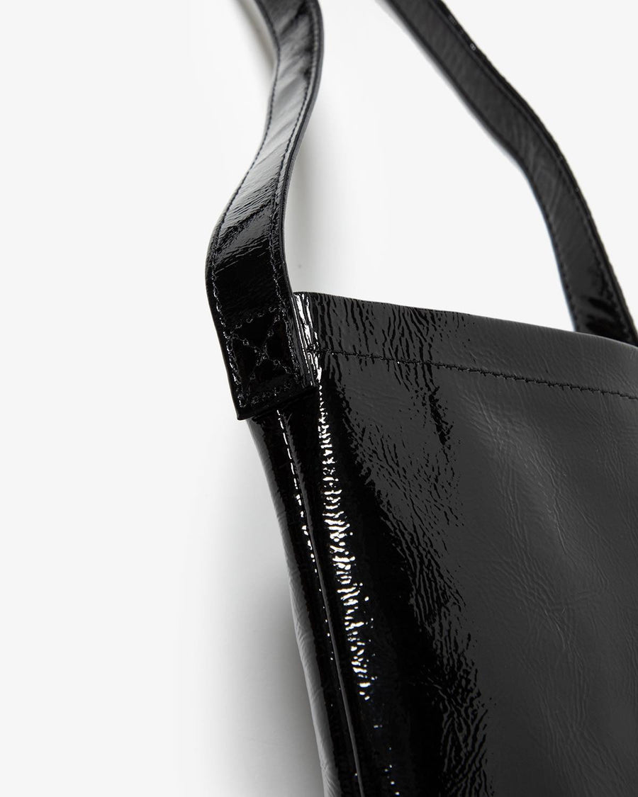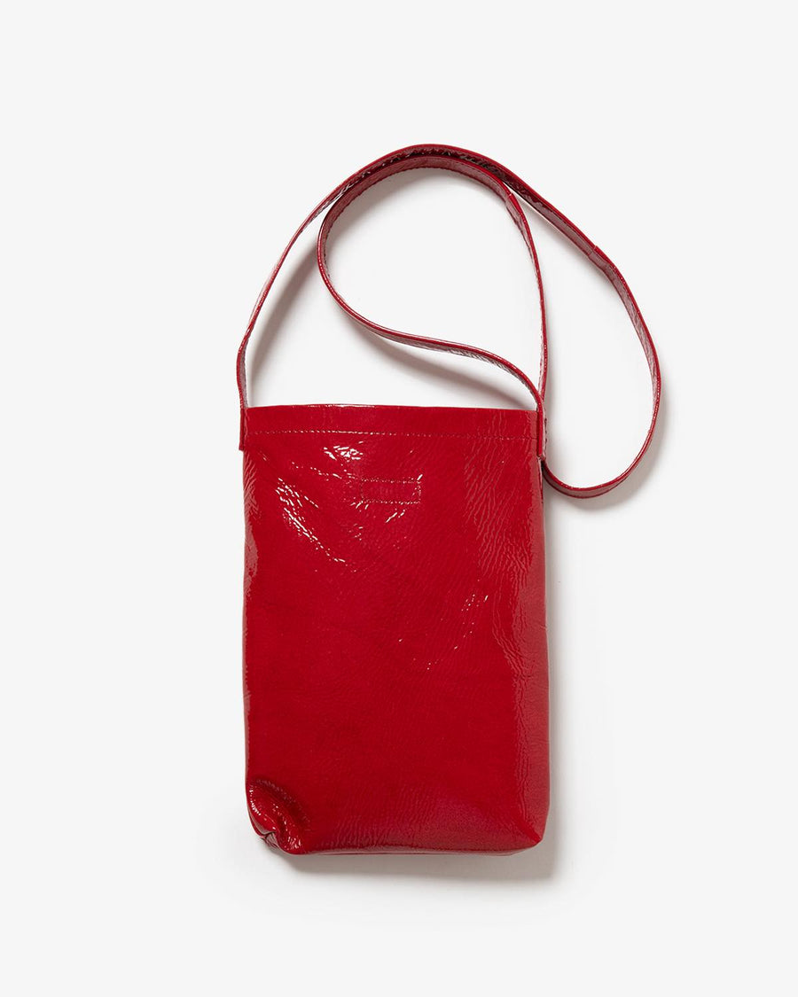 The "PATENT HORSE SHOULDER SMALL" from the "PATENT HORSE SERIES," inspired by Hender Scheme's classic bags, features patent leather laminated with polyurethane film on horse leather.
