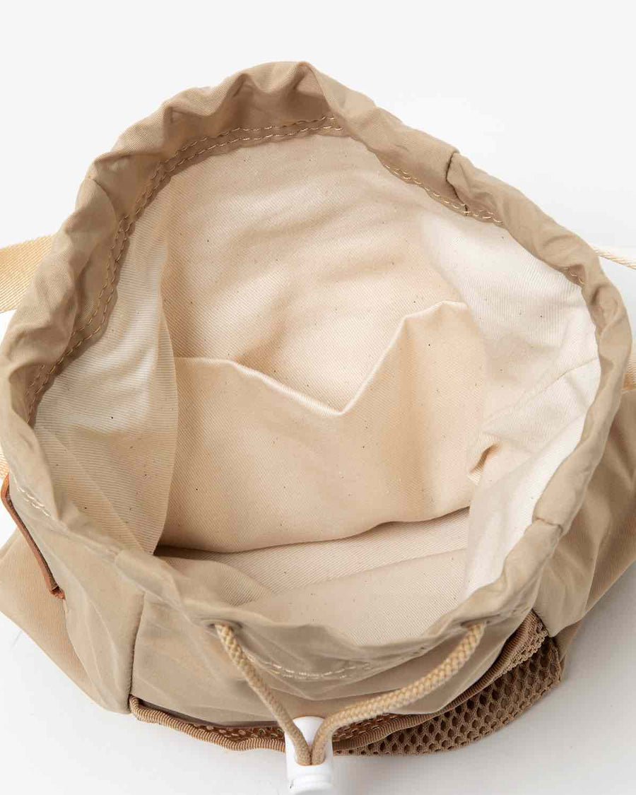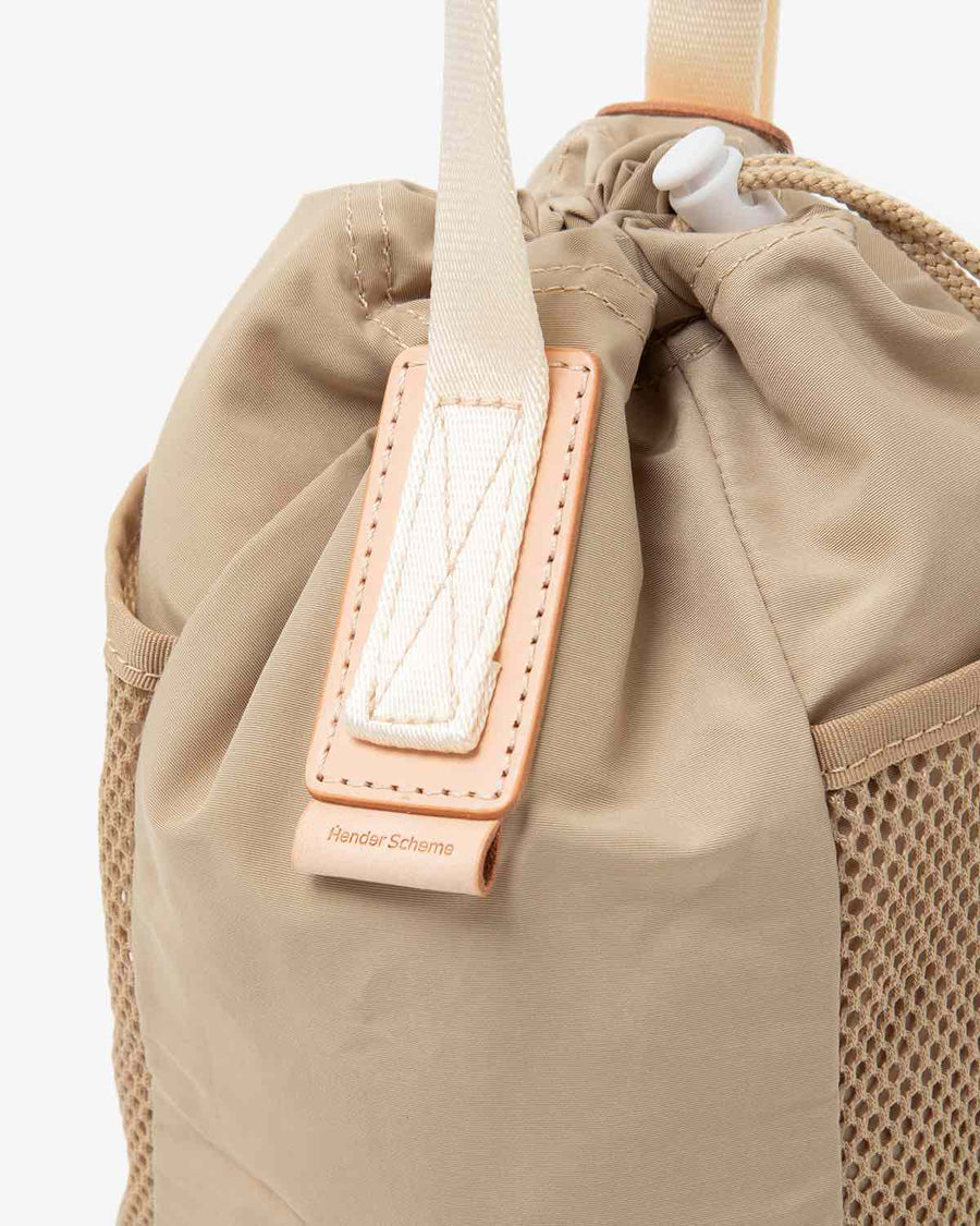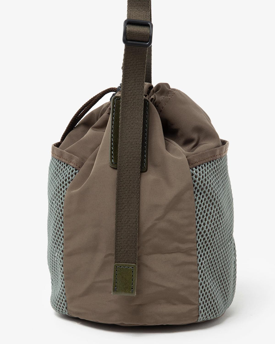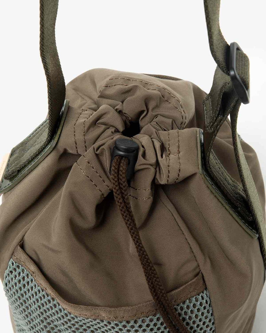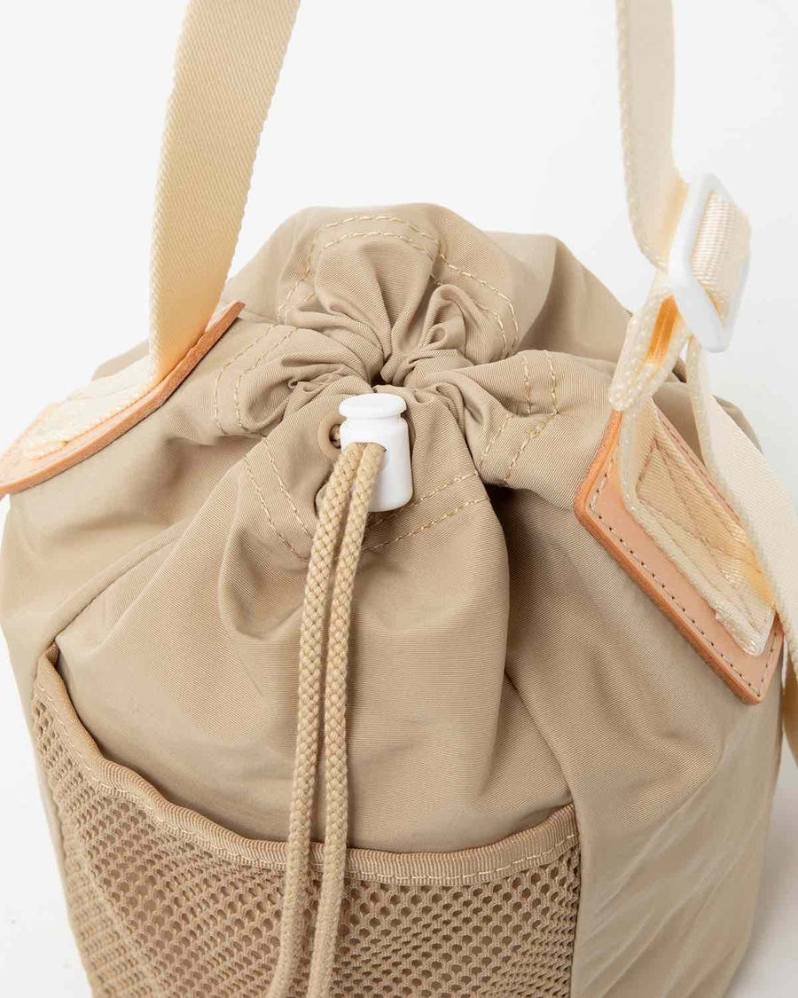 The FUNCTIONAL BUCKET BAG from Hender Scheme features a cotton-nylon blend, exposed structure, leather accents, and water-repellent fabric.