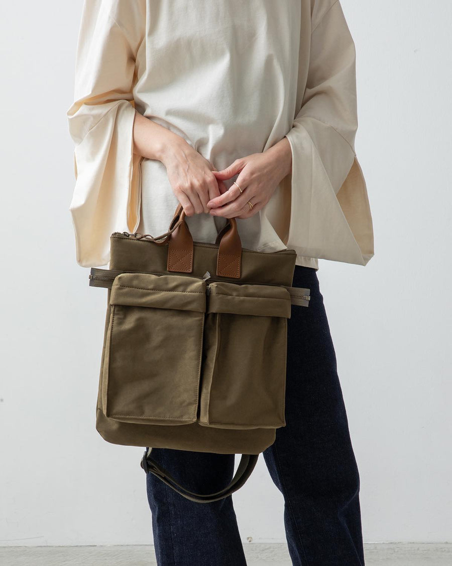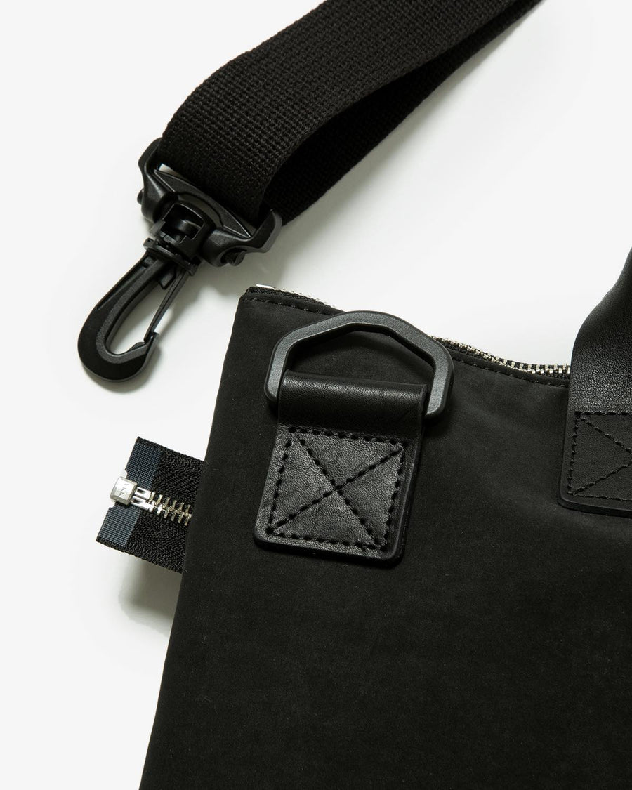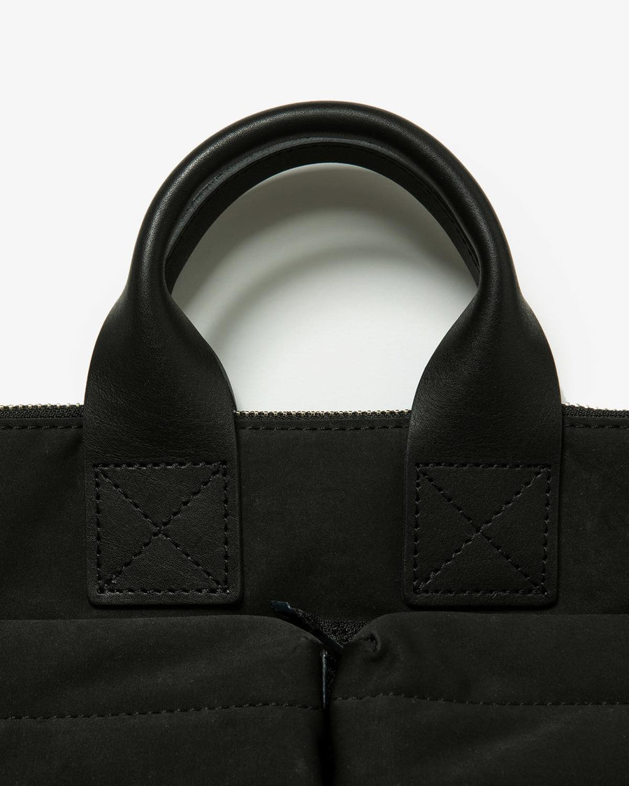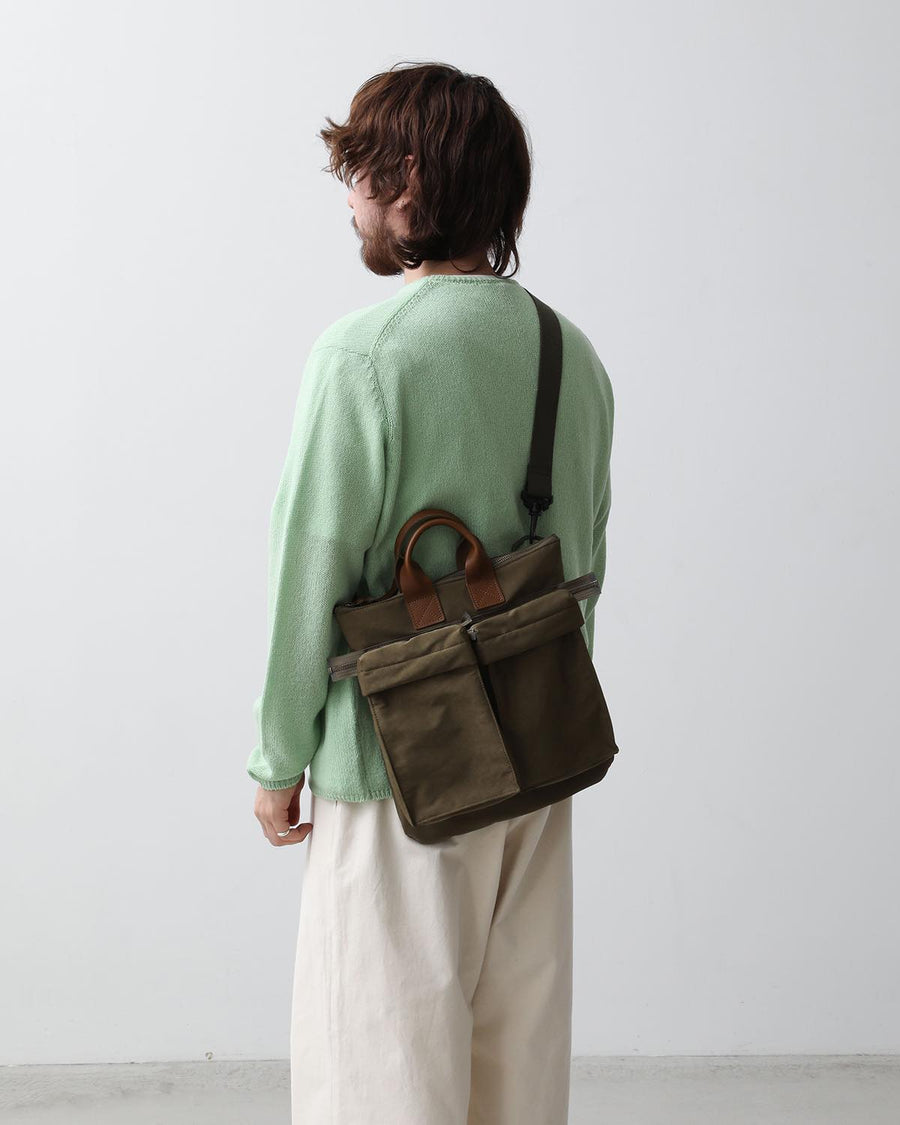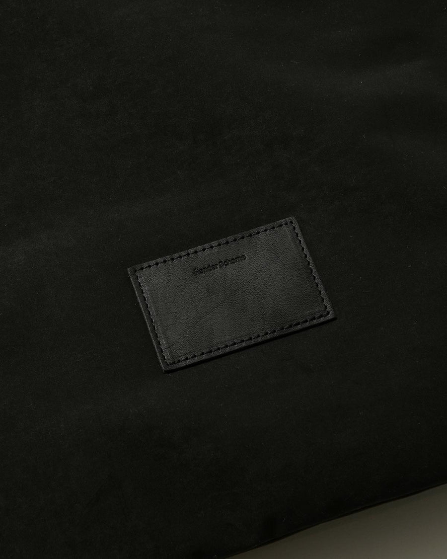 Hender Scheme’s HELMET BAG SMALL uses textured polyester nylon and oiled steer leather handles.