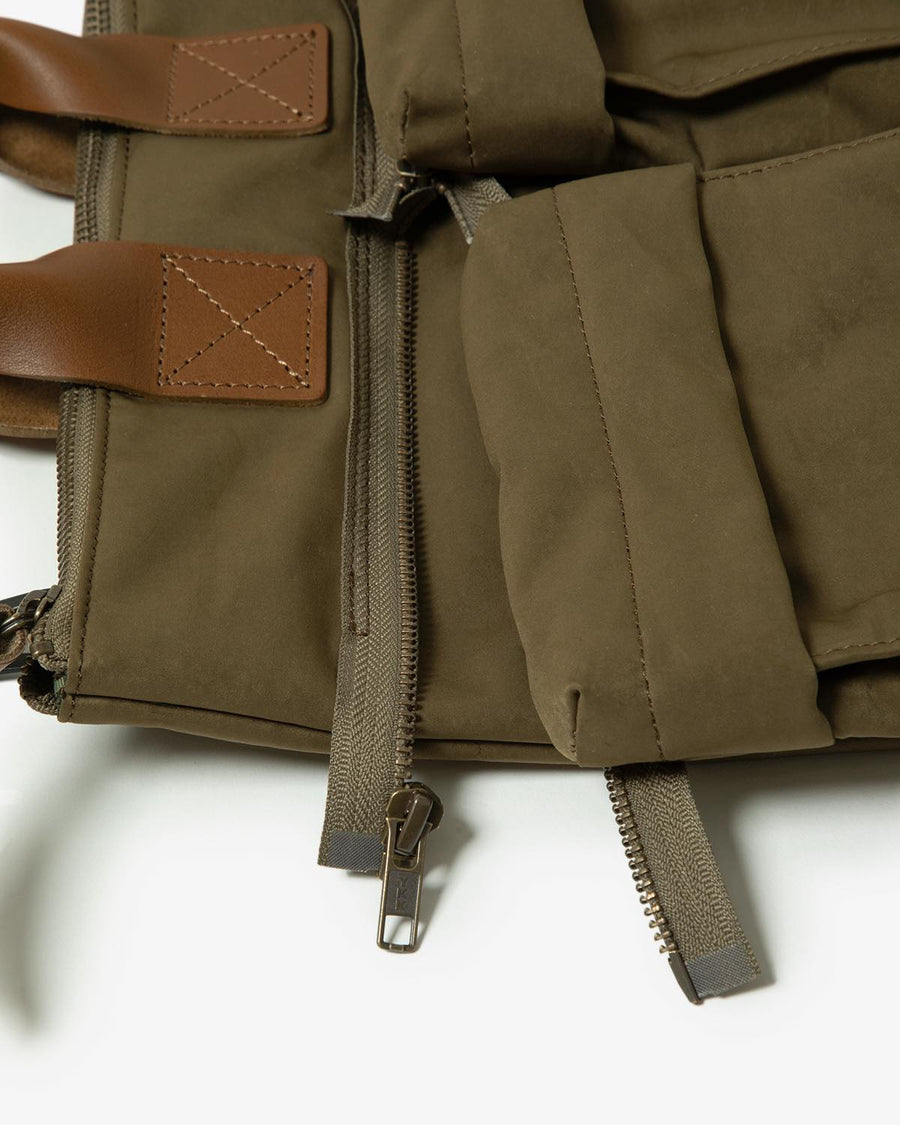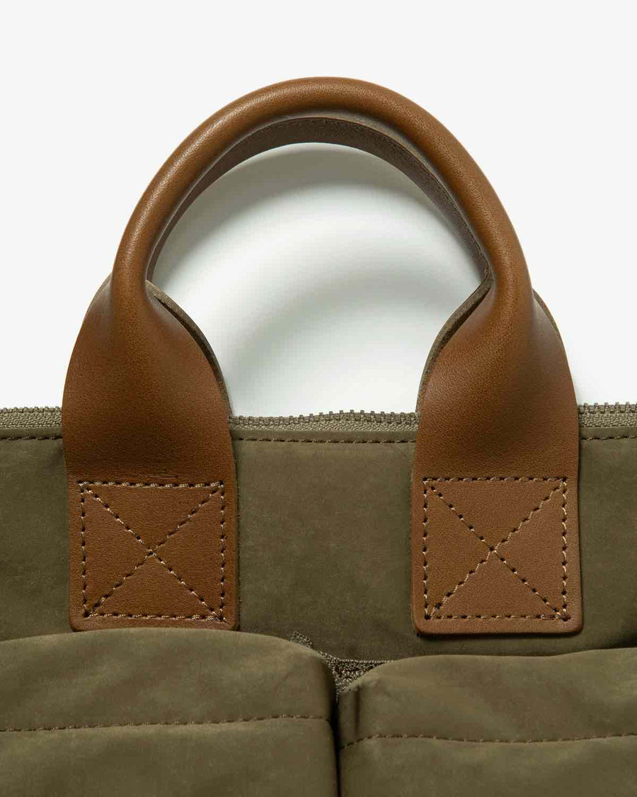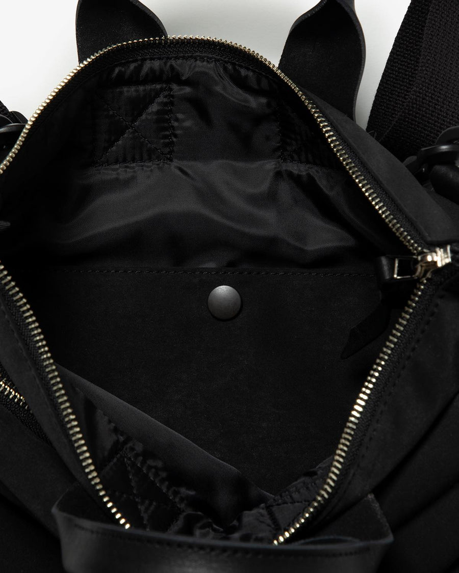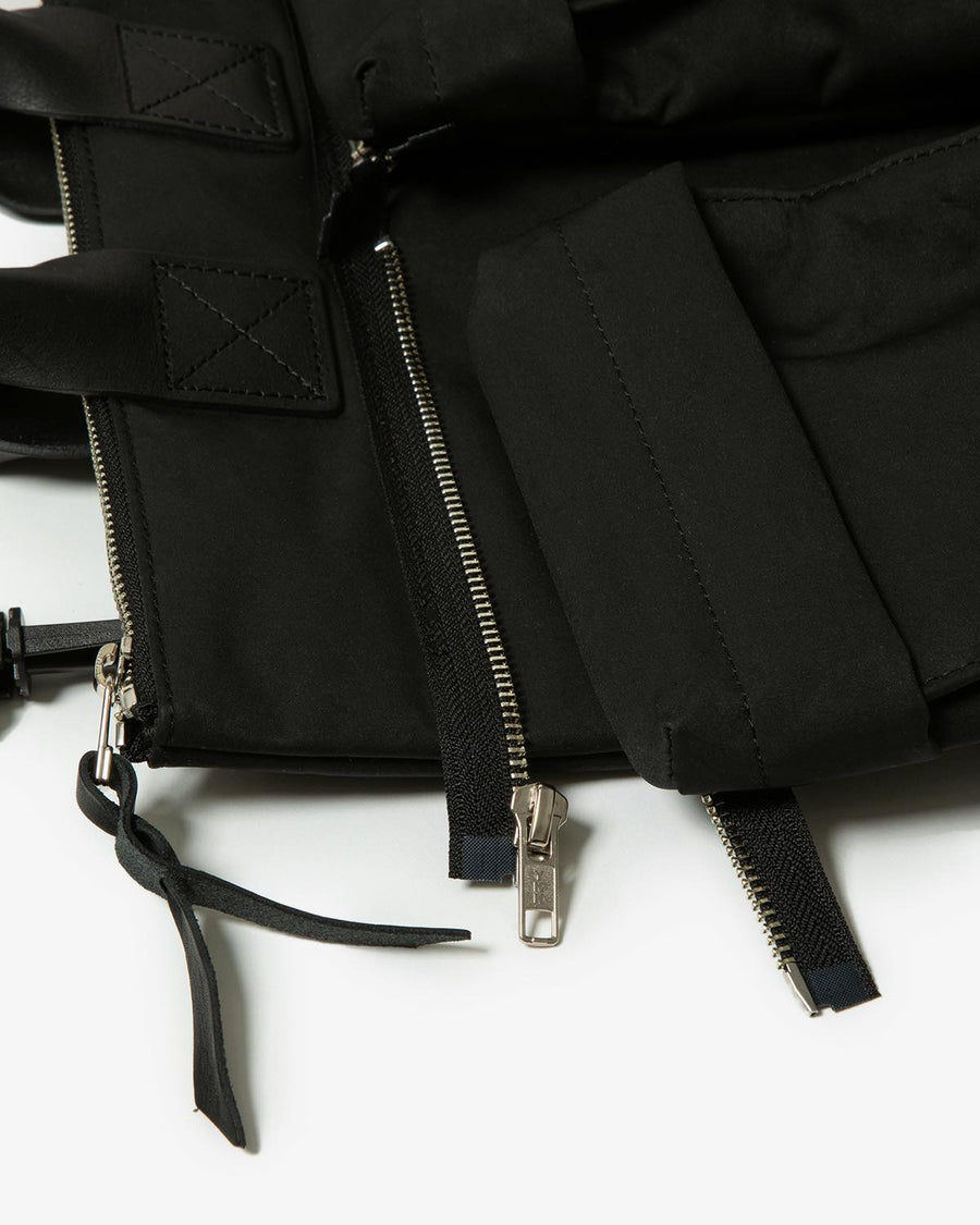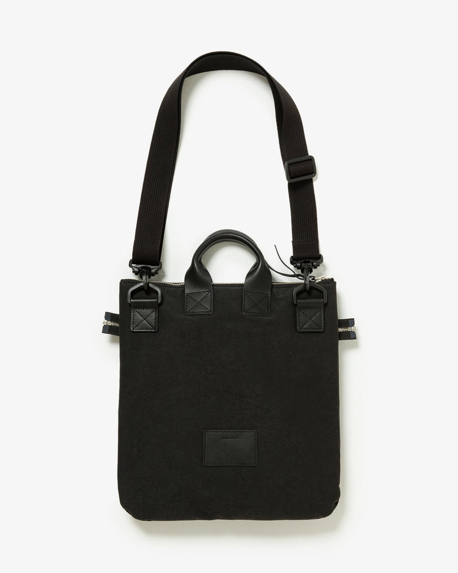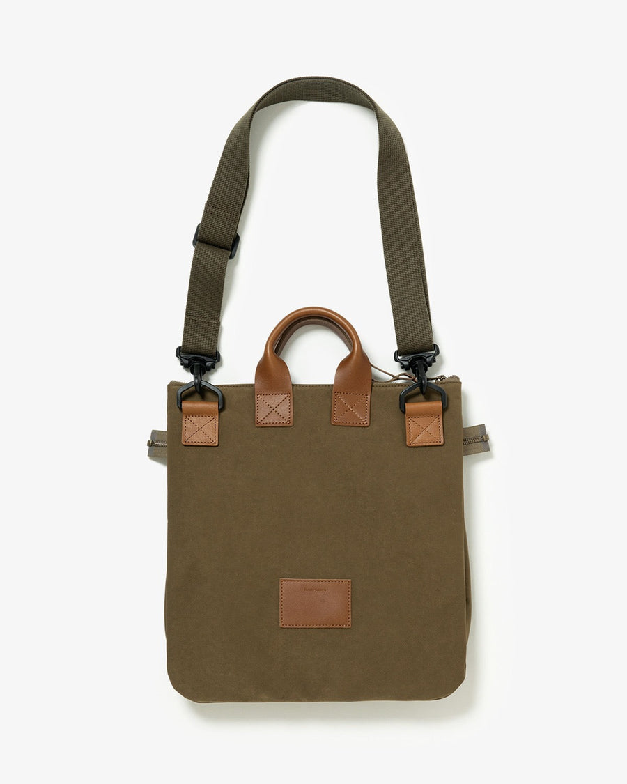 Hender Scheme’s HELMET BAG SMALL uses textured polyester nylon and oiled steer leather handles.