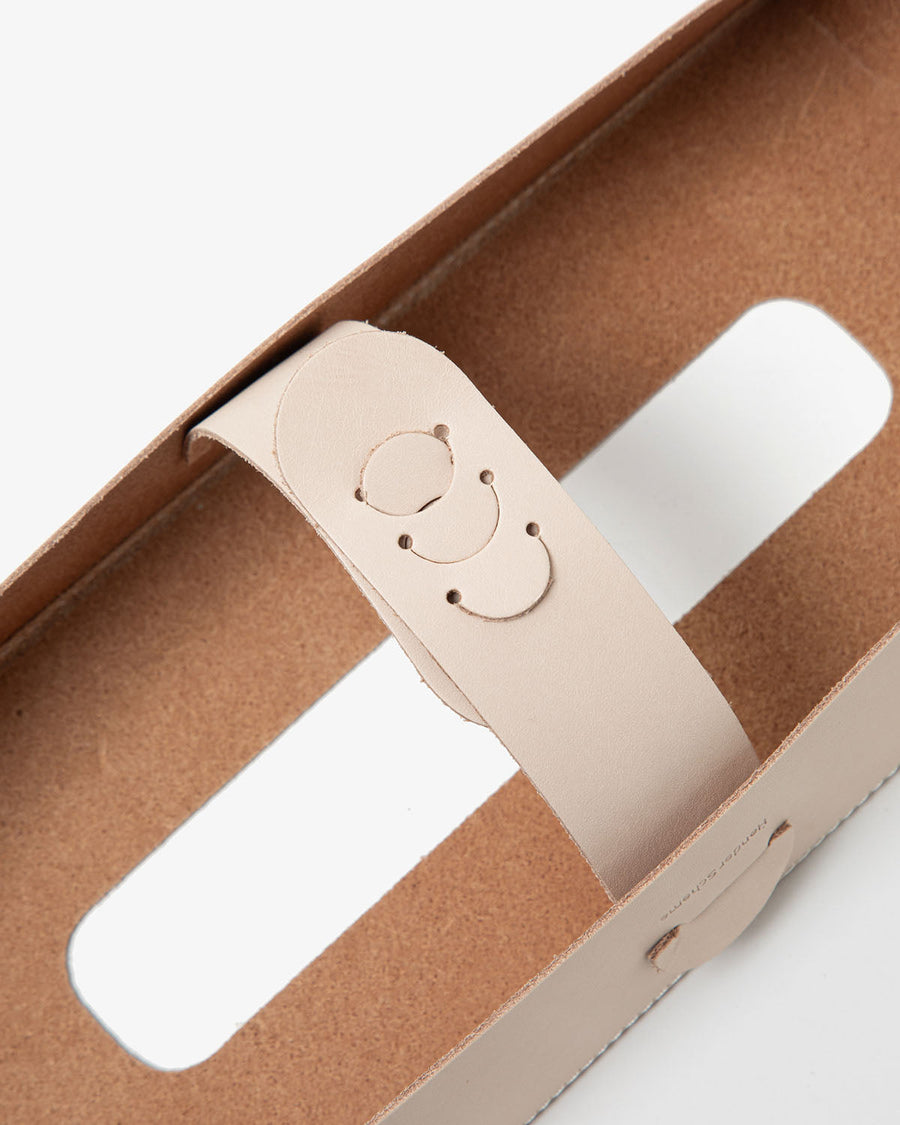 From the VEGETABLE TANNING SERIES, the TISSUE BOX CASE is made of vegetable-tanned cow leather, with a 3D design and adjustable bottom leather connections for varying tissue box heights.