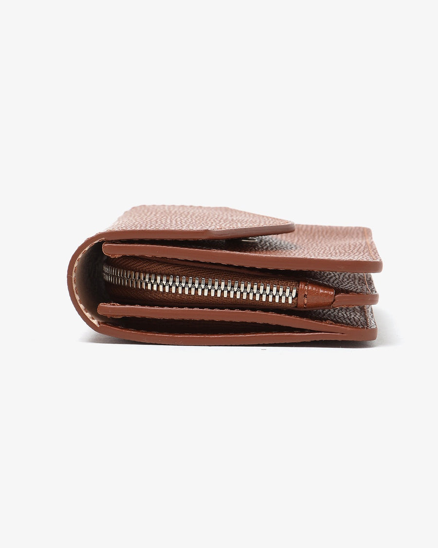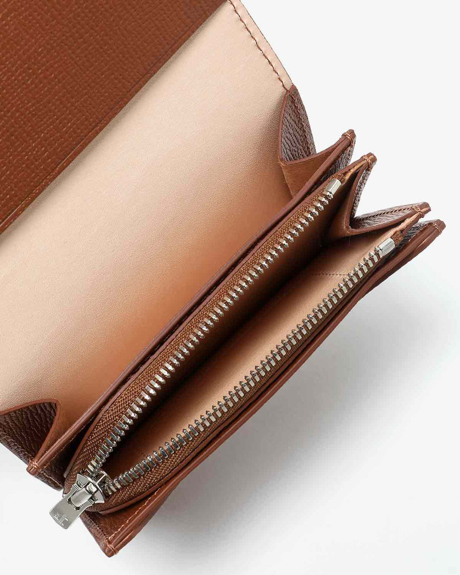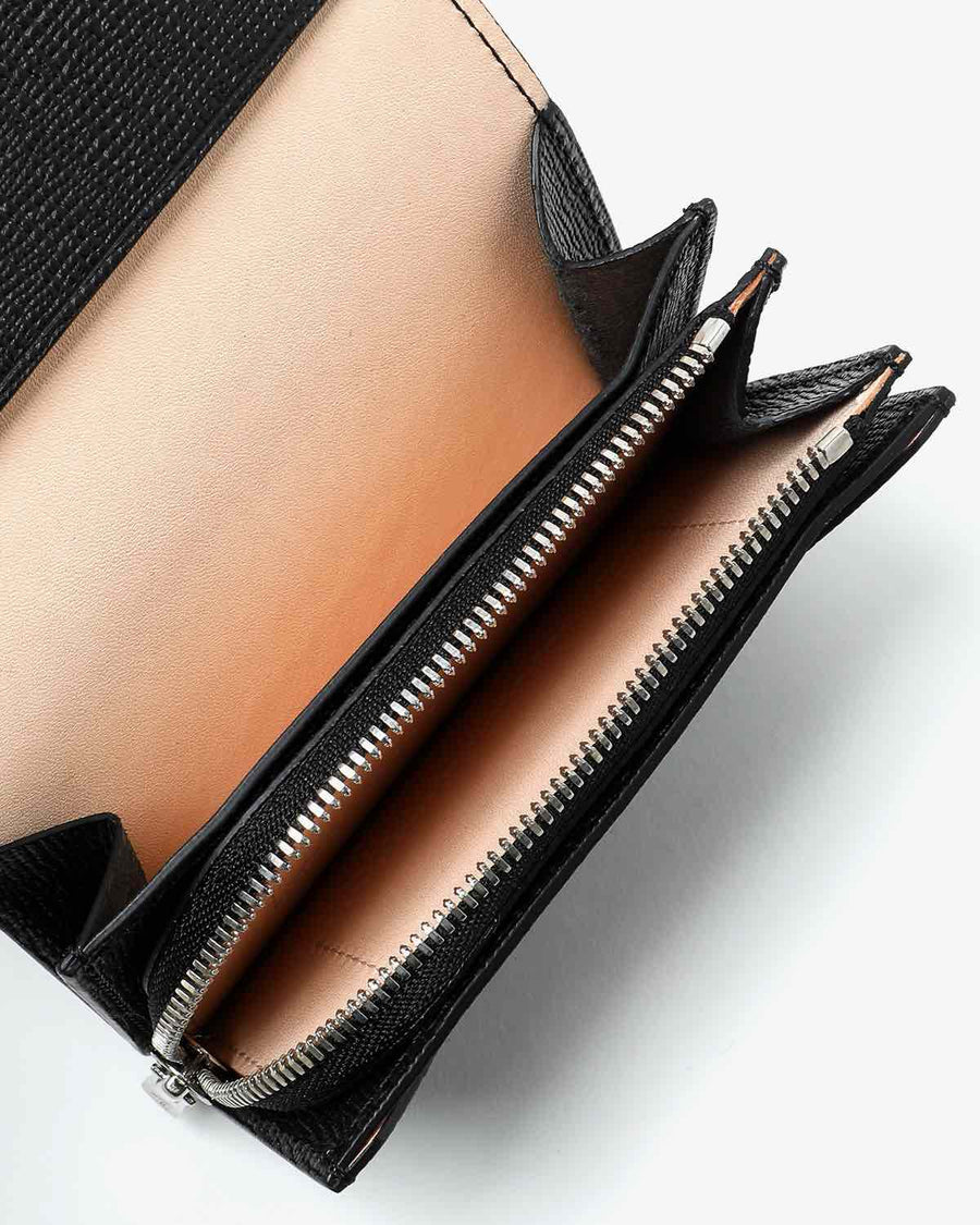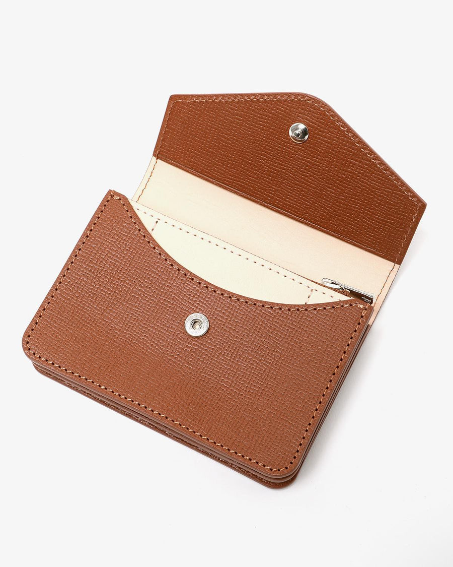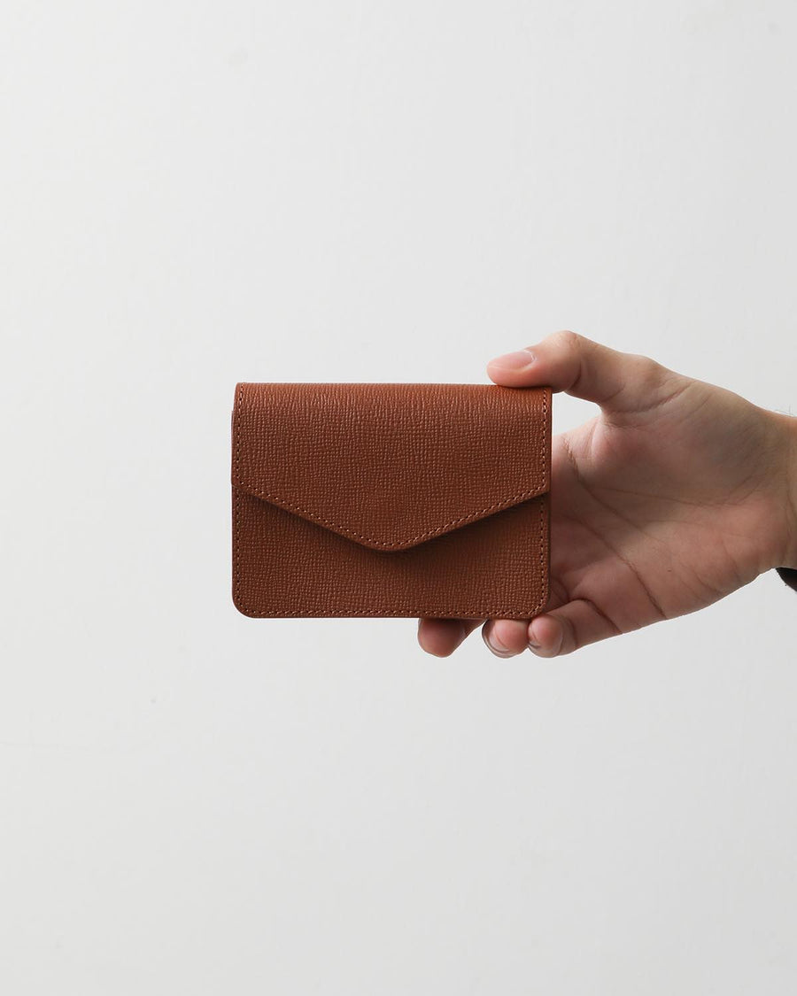The "FLAP BILLFOLD" from the "SAFFIANO SERIES" features embossed leather, an envelope design with a coin pocket divider, and a flap closure.
