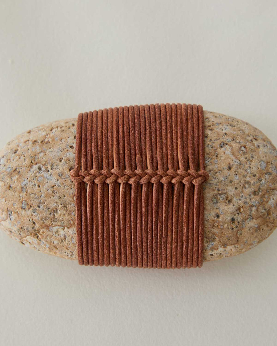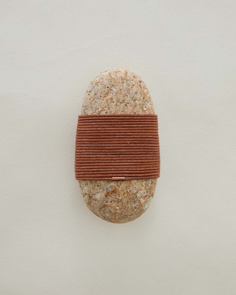 WRAPPED STONE encases naturally formed stones in leather cords using traditional Japanese knotting, symbolizing harmony between nature, craft, and time.
