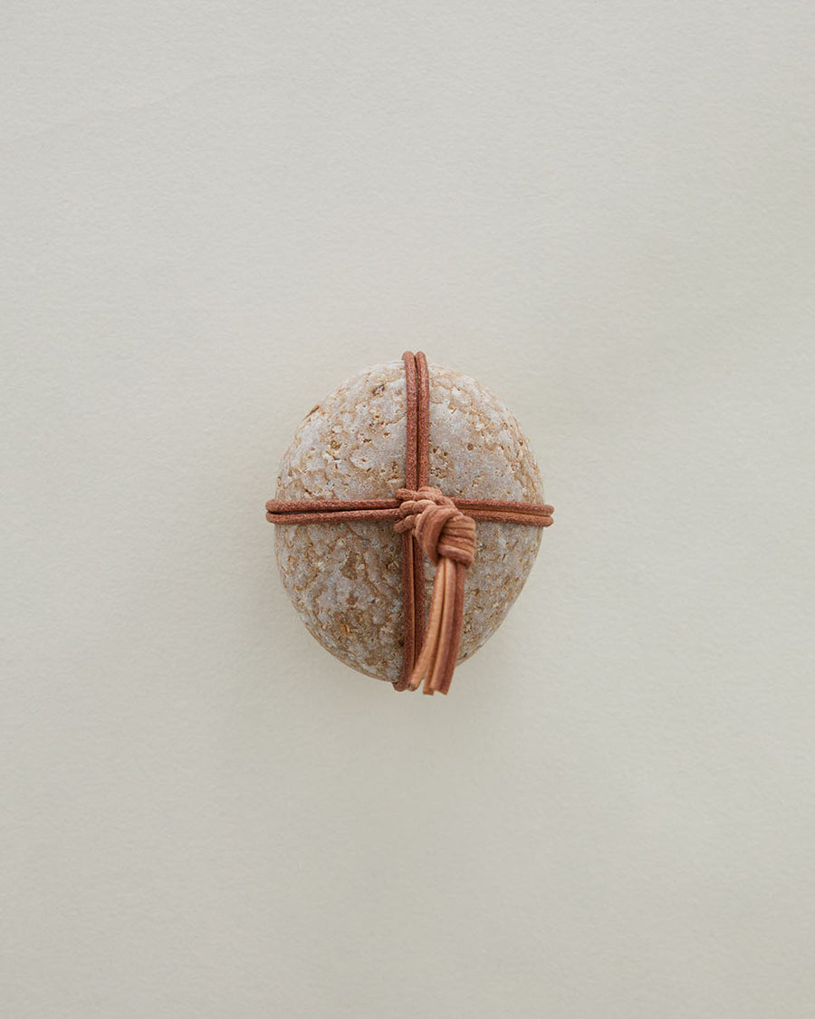 自然の中で生まれた豊かなフォルムを持つ石を、革紐を使い伝統的な結びによって包んだ作品「SEKIMORI STONE」です。