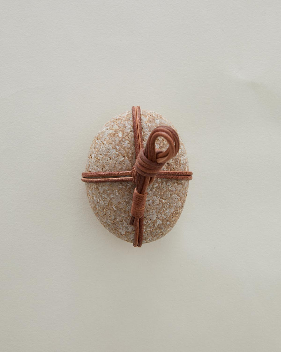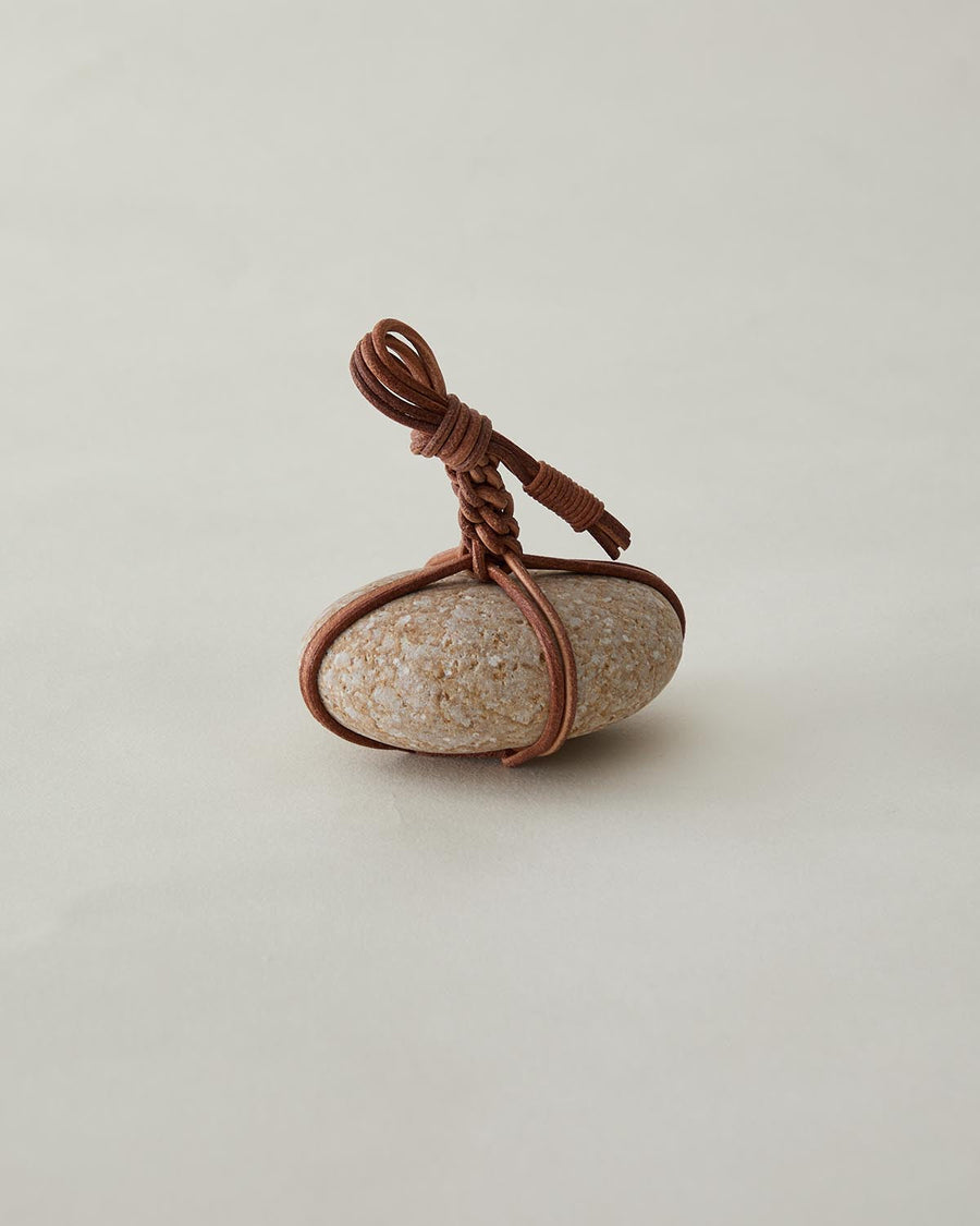 自然の中で生まれた豊かなフォルムを持つ石を、革紐を使い伝統的な結びによって包んだ作品「SEKIMORI STONE」です。