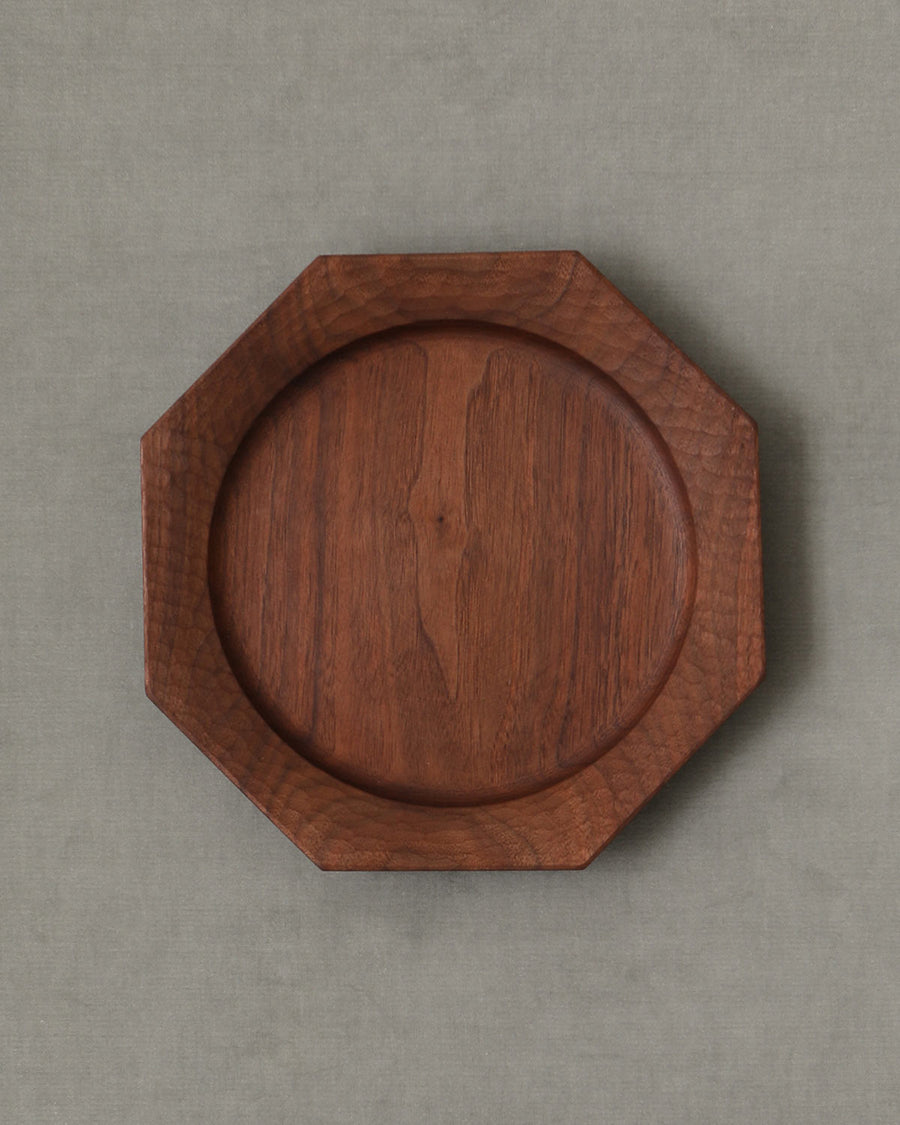 Minimal Octagonal Plate by Koji Hori, hand carved from walnut wood. Inspired by the concept of natural simplicity, Hori's work exudes the gentle warmth of wood. Crafted with a prepolymer finish for added strength while maintaining its natural texture, this plate is coated with perilla oil, making it easy to care for with just cold or lukewarm water—no soap needed.