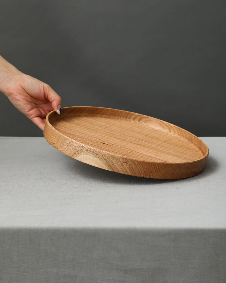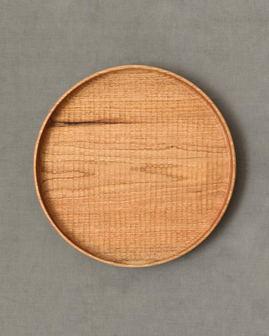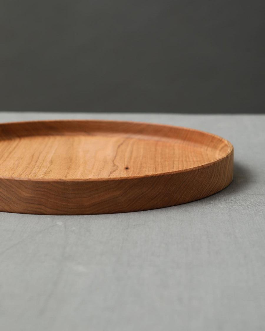 Round tray by Koji Hori, hand-carved from walnut and ideal for tea time. Inspired by the concept of natural simplicity, Hori's work exudes the gentle warmth of wood. Crafted with a prepolymer finish for added strength while maintaining its natural texture, this plate is coated with perilla oil, making it easy to care for with just cold or lukewarm water—no soap needed.