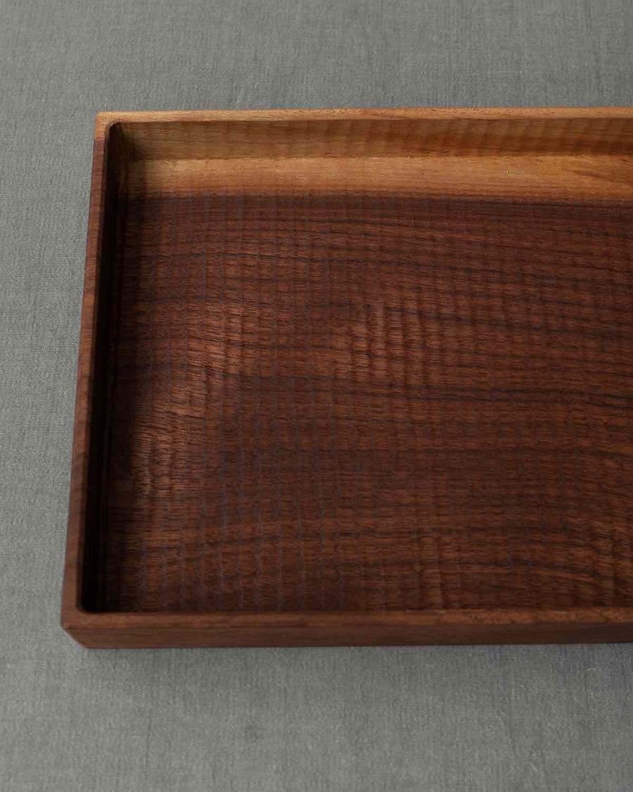 Minimal deep rectangular tray by Koji Hori, hand-carved from walnut and ideal for tea time. Inspired by the concept of natural simplicity, Hori's work exudes the gentle warmth of wood. Crafted with a prepolymer finish for added strength while maintaining its natural texture, this plate is coated with perilla oil, making it easy to care for with just cold or lukewarm water—no soap needed.