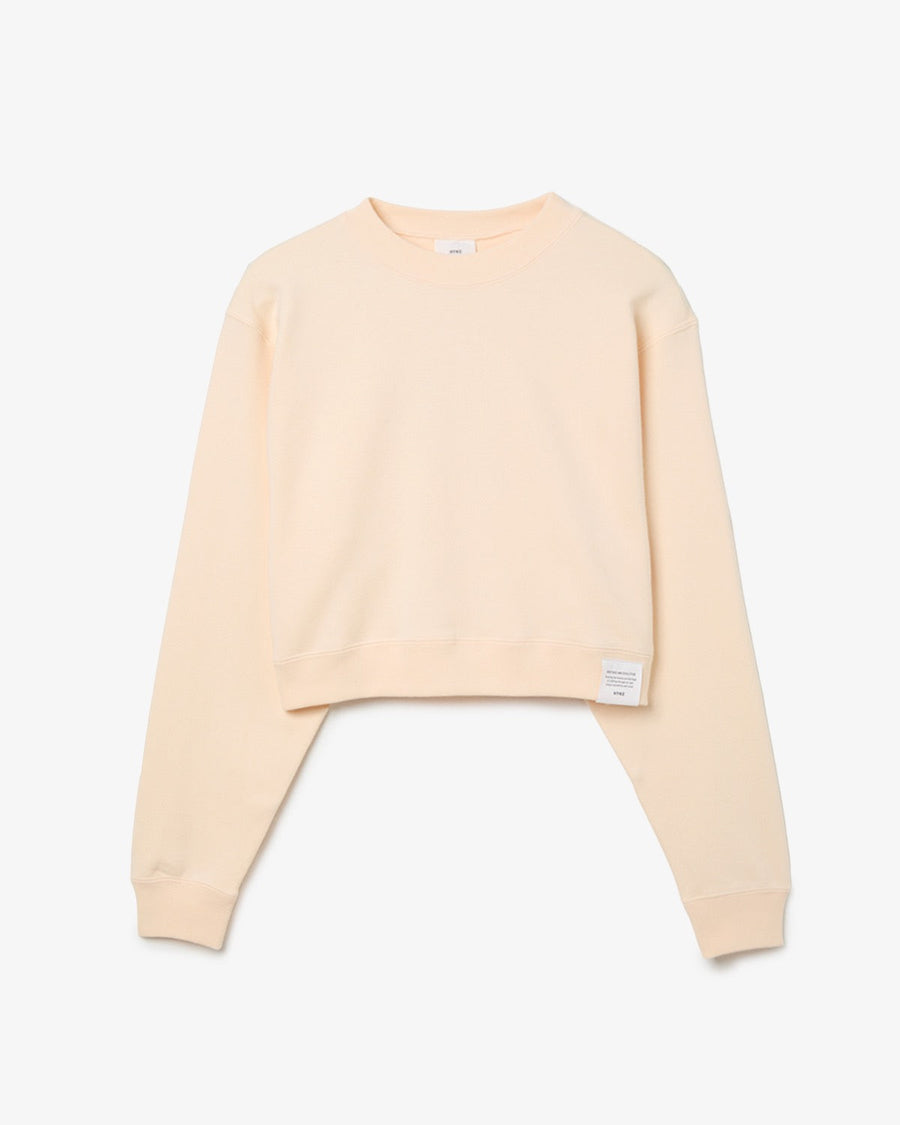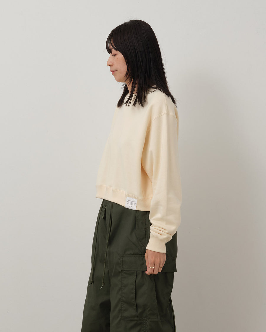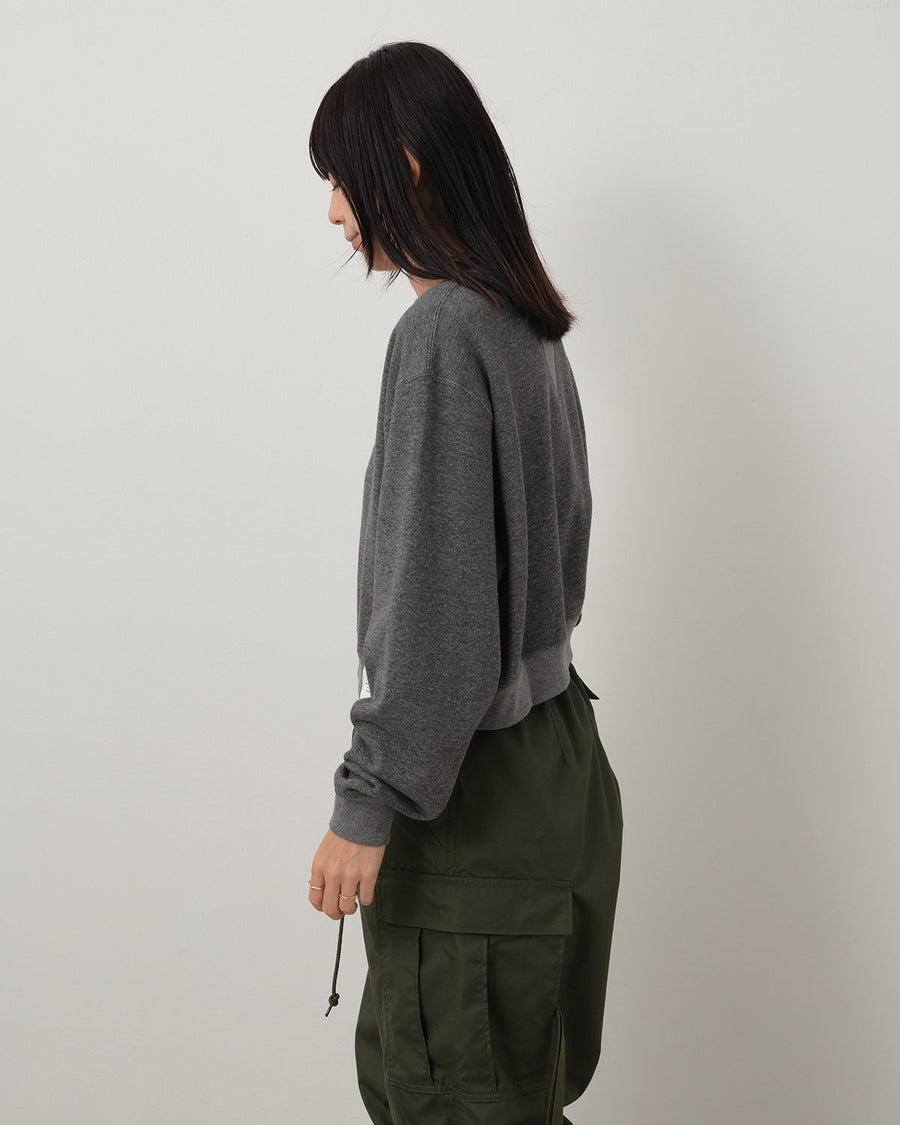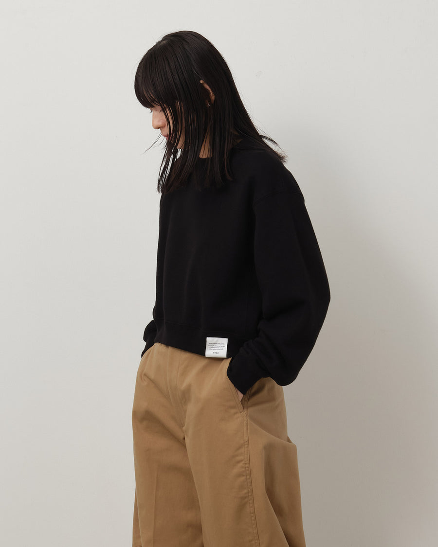 Cropped sweatshirt made from soft fleece knit on a vintage Japanese Azuma knitting machine, offering a plush, voluminous texture.