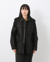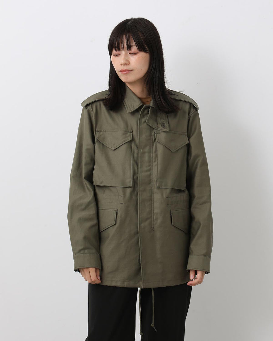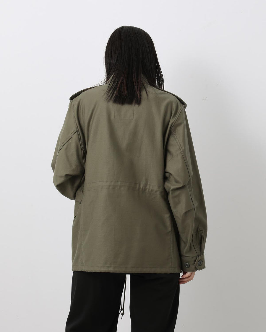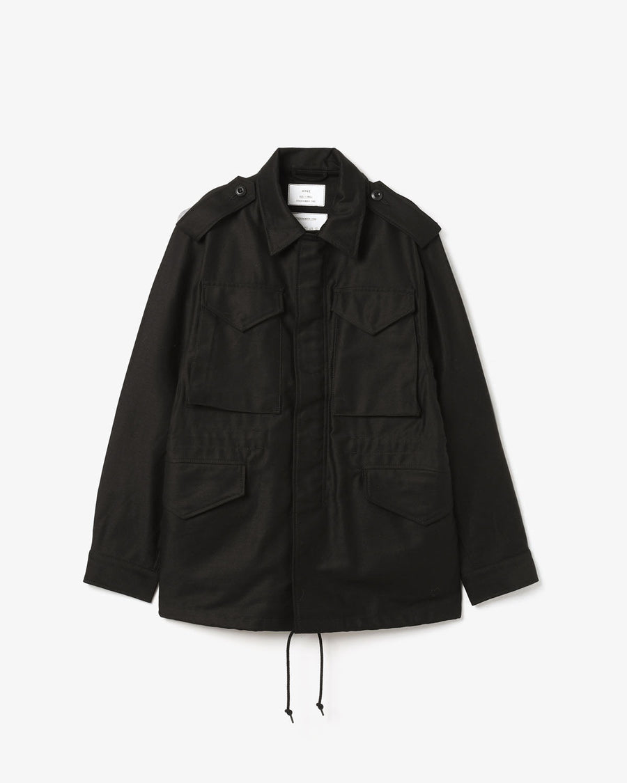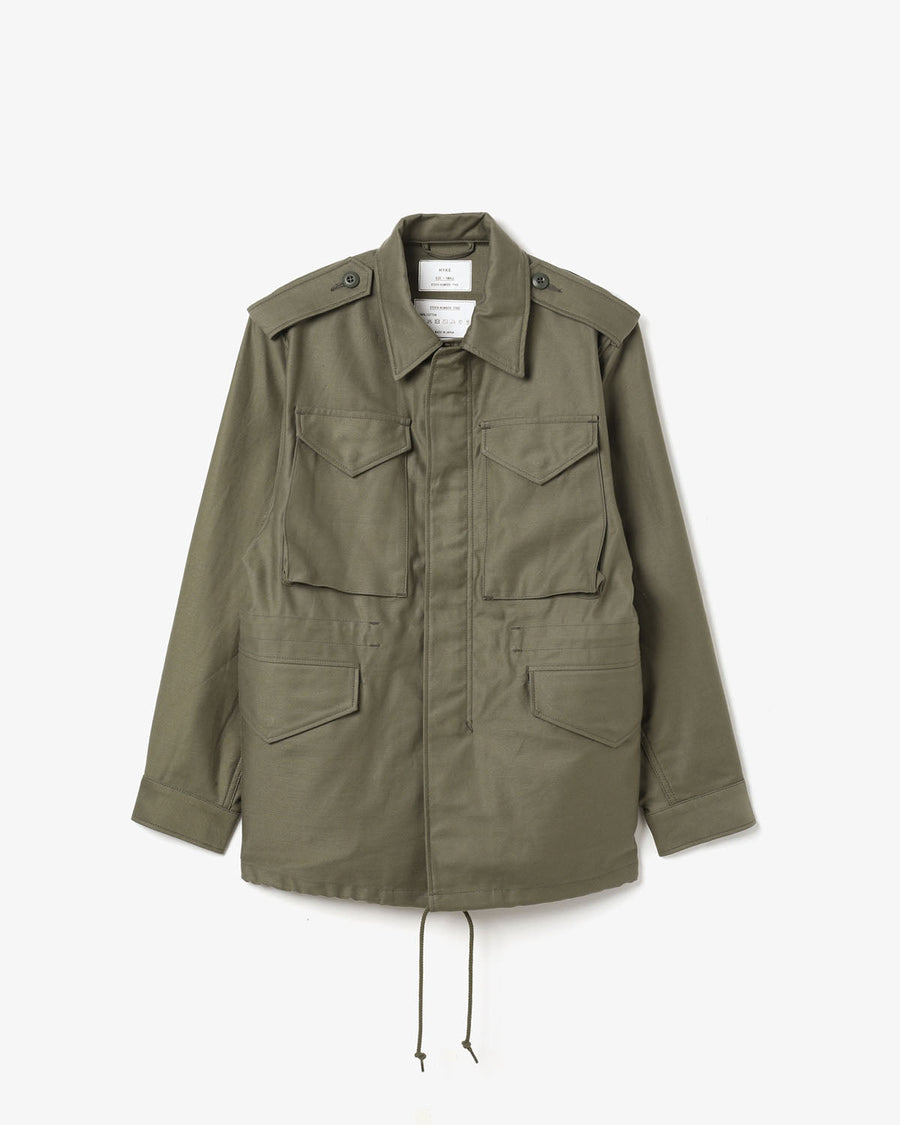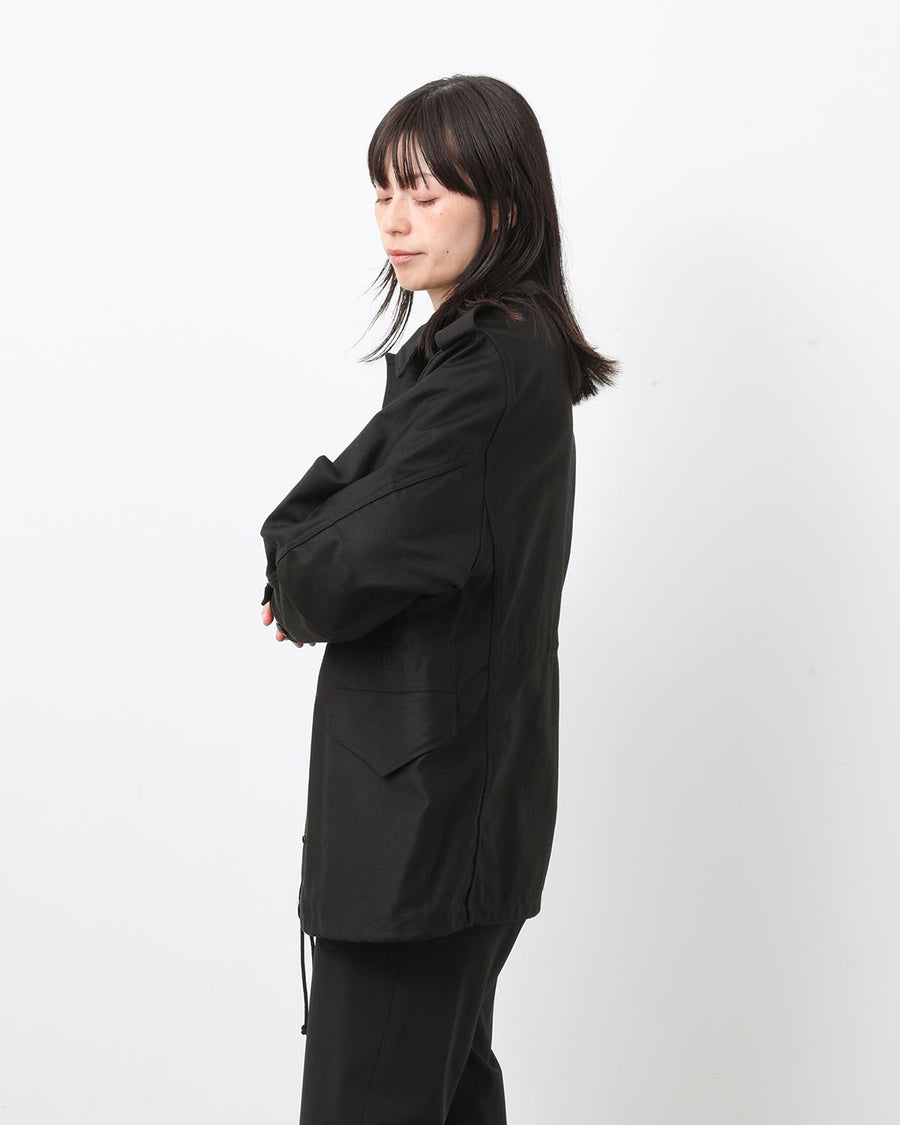 A field jacket made from back satin (using the reverse side of satin fabric) with a subtle sheen and firmness, inspired by the U.S. Army M-51 field jacket.