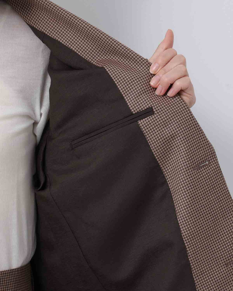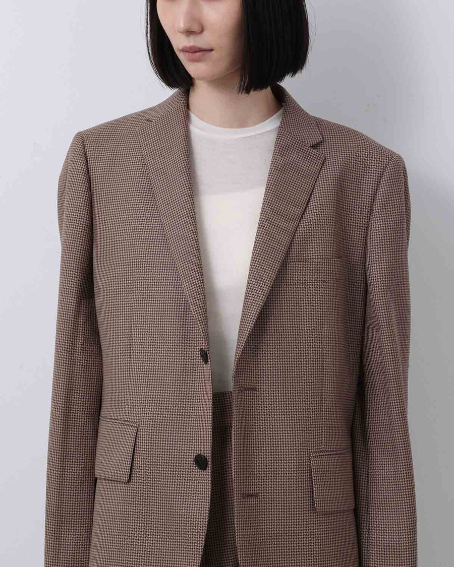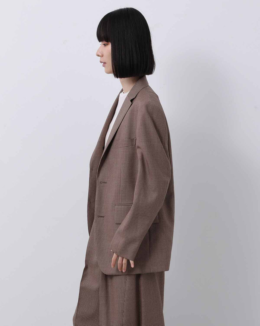 This blazer is made from a high-count worsted yarn in a houndstooth check pattern, woven densely for a luxurious feel. The design features slits in the sleeves, adding a cape-like nuance.