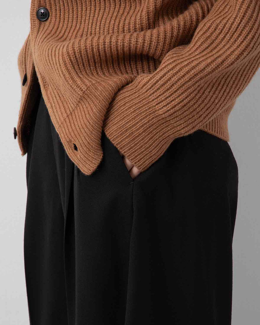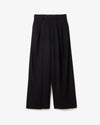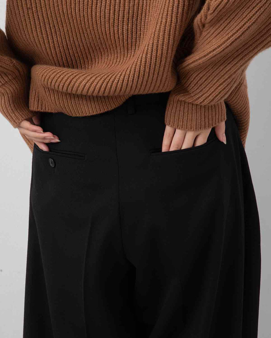 Luxury trousers in soft, lustrous wool-polyester blend (Doeskin) with a sleek waist and relaxed barrel silhouette from hip to thigh.