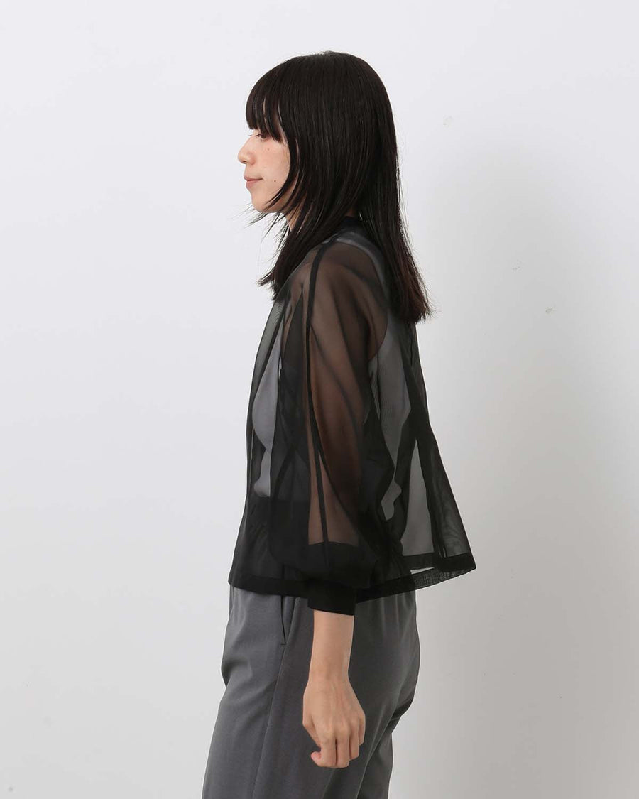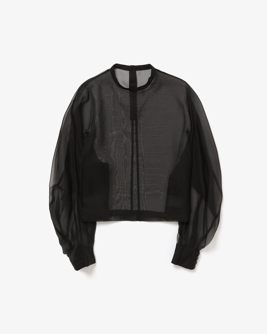 A blouse in polyester organza with voluminous sleeves and an elegant sheer finish, creating a flowing silhouette.