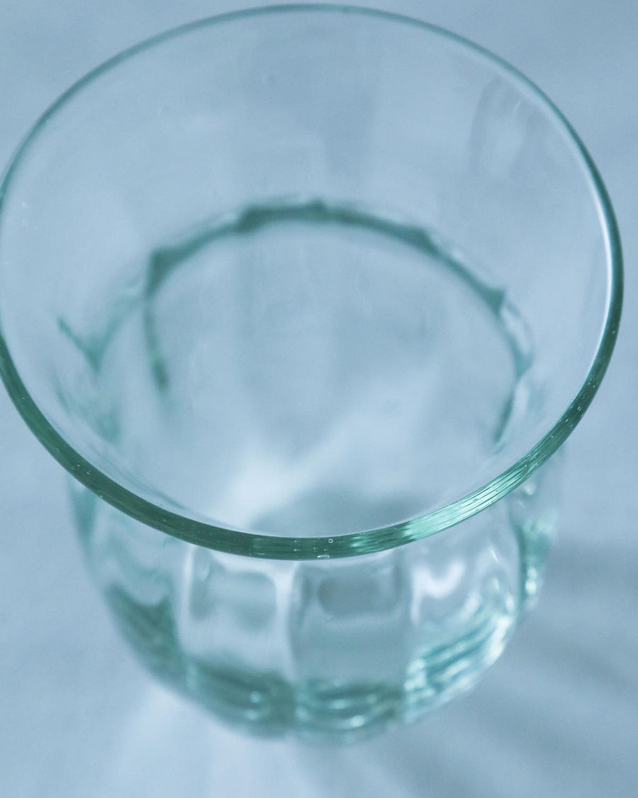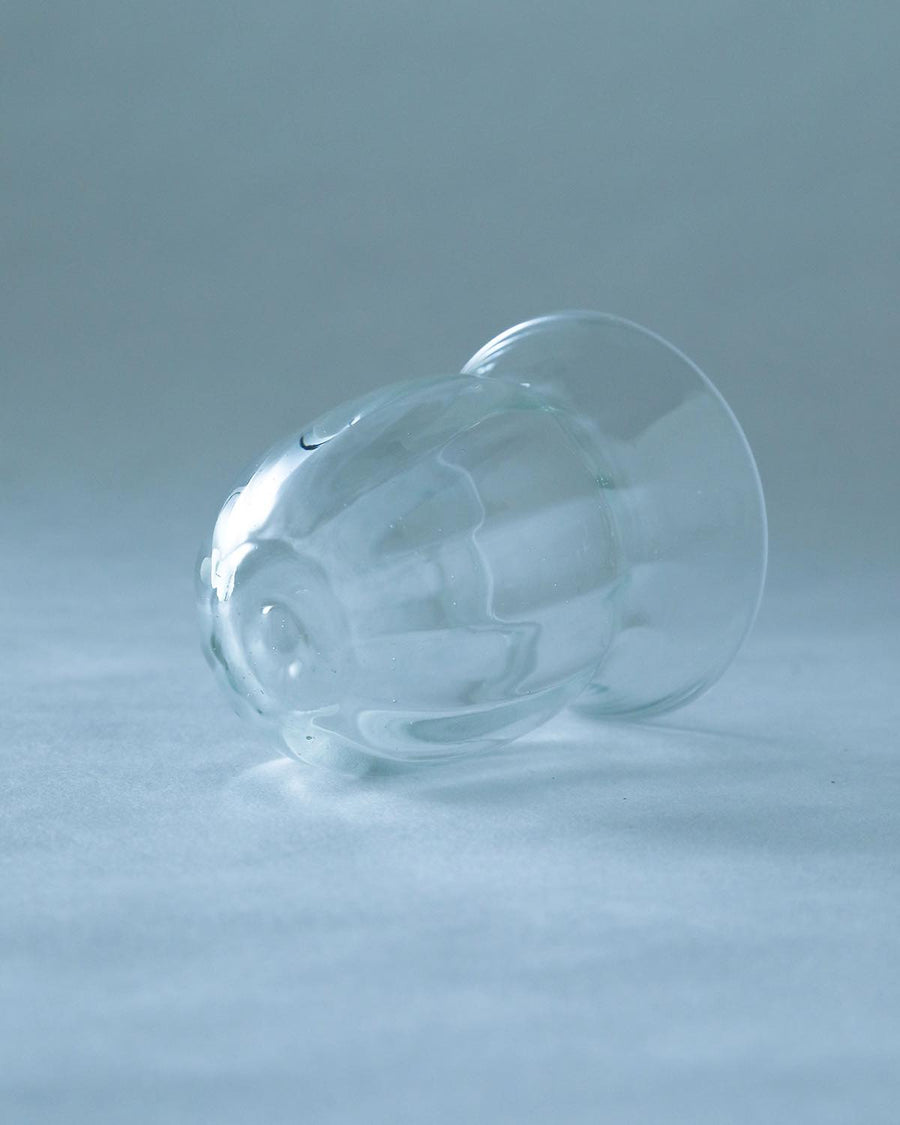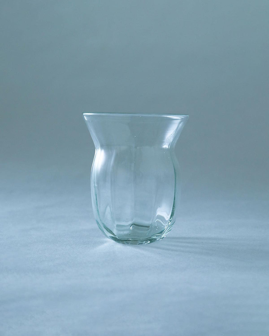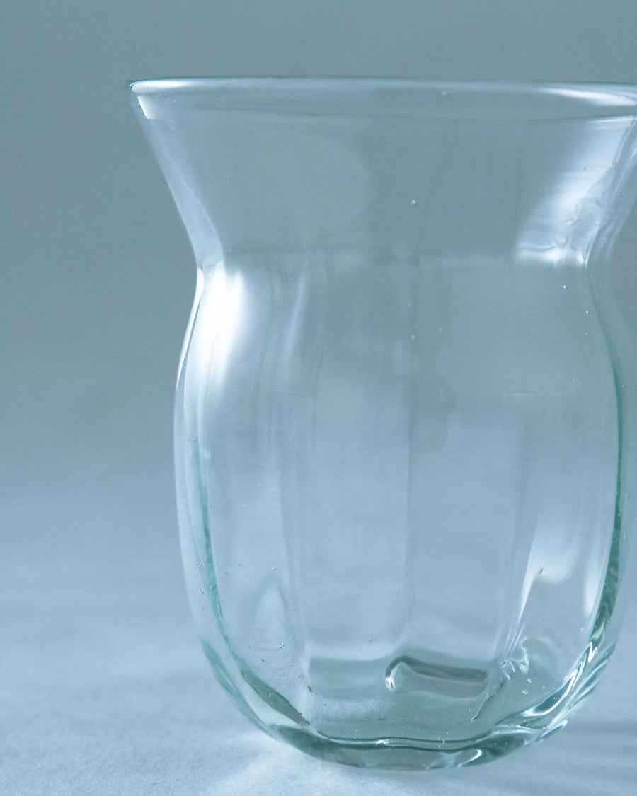 This glass is handmade by Okinawa-based artist Miyo Oyabu, featuring a wide mouth and expressive ribbed detailing.