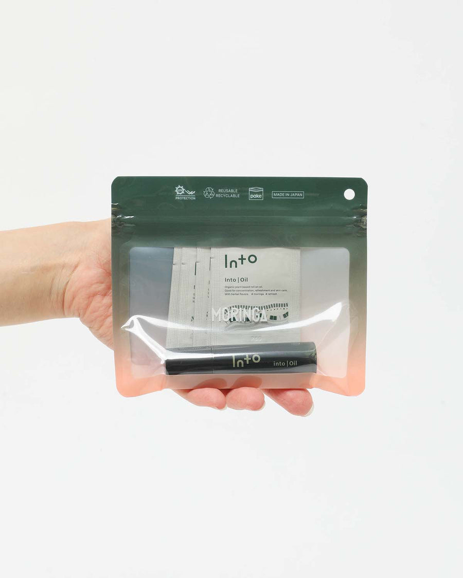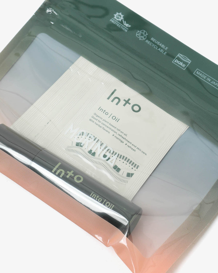 Travel set with Into Oil roll-on and single-use packets, in a There There–designed Pake zip bag for travel or daily use.