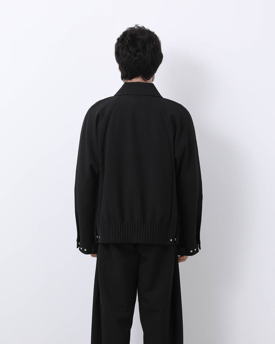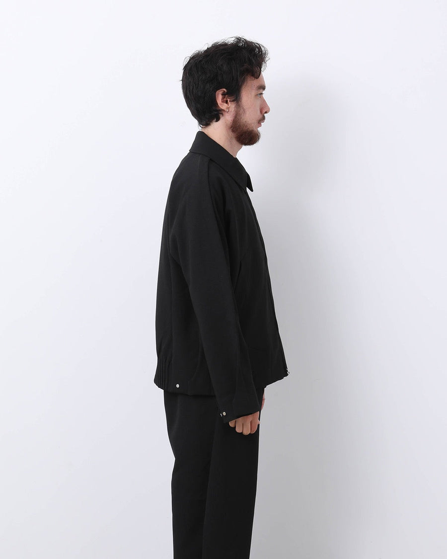 The UVAS JACKET features soft double-weave melange fabric, sculptural “fin” seams, dropped armholes, T-cut sleeves, and mirrored-tab cuffs for a functional yet striking silhouette.