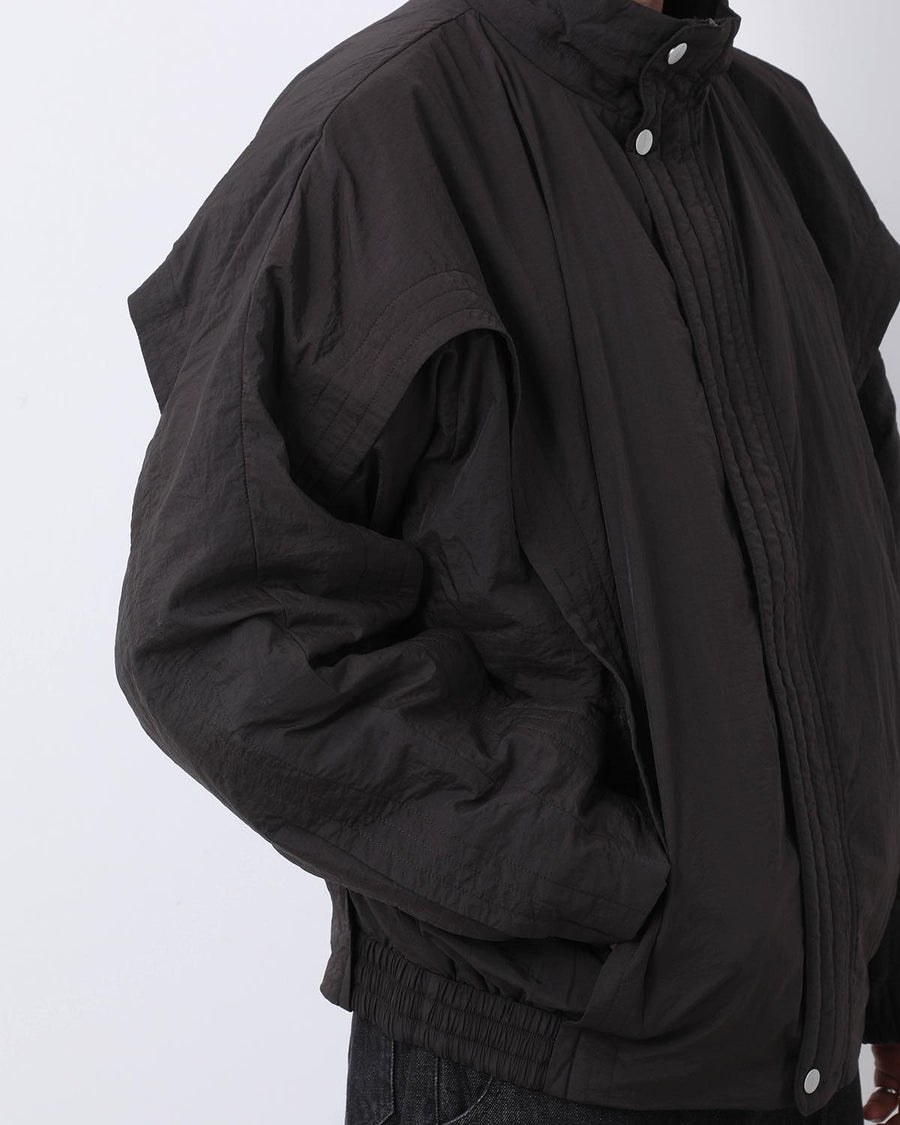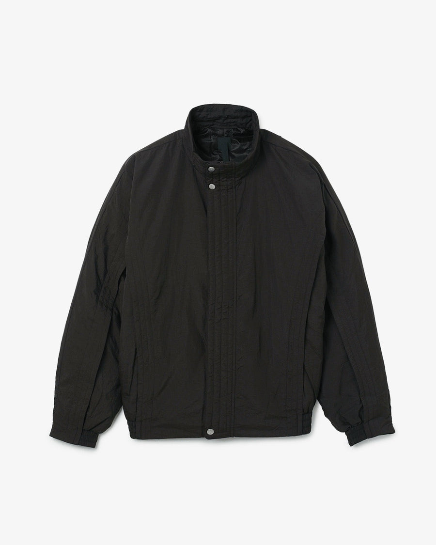 The YOT JACKET features lightweight crisp nylon, a padded silhouette, “fin”-framed side pockets, elasticized cuffs and hem, and twin collar studs for a structured yet comfortable look.
