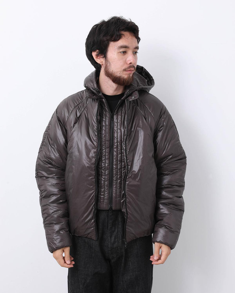 The SINH JACKET features lightweight padded nylon, a streamlined silhouette, double-front closure with internal half-vest, and an adjustable elasticized hood for warmth and functionality.