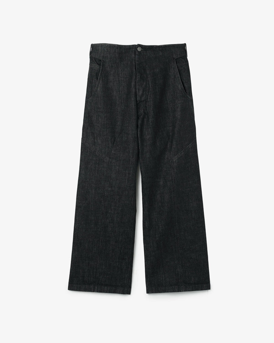 The OM TROUSER features stone-washed denim, an integrated belt, side-entry and darted back pockets, and a straight-leg silhouette with dart detailing for a structured fit.