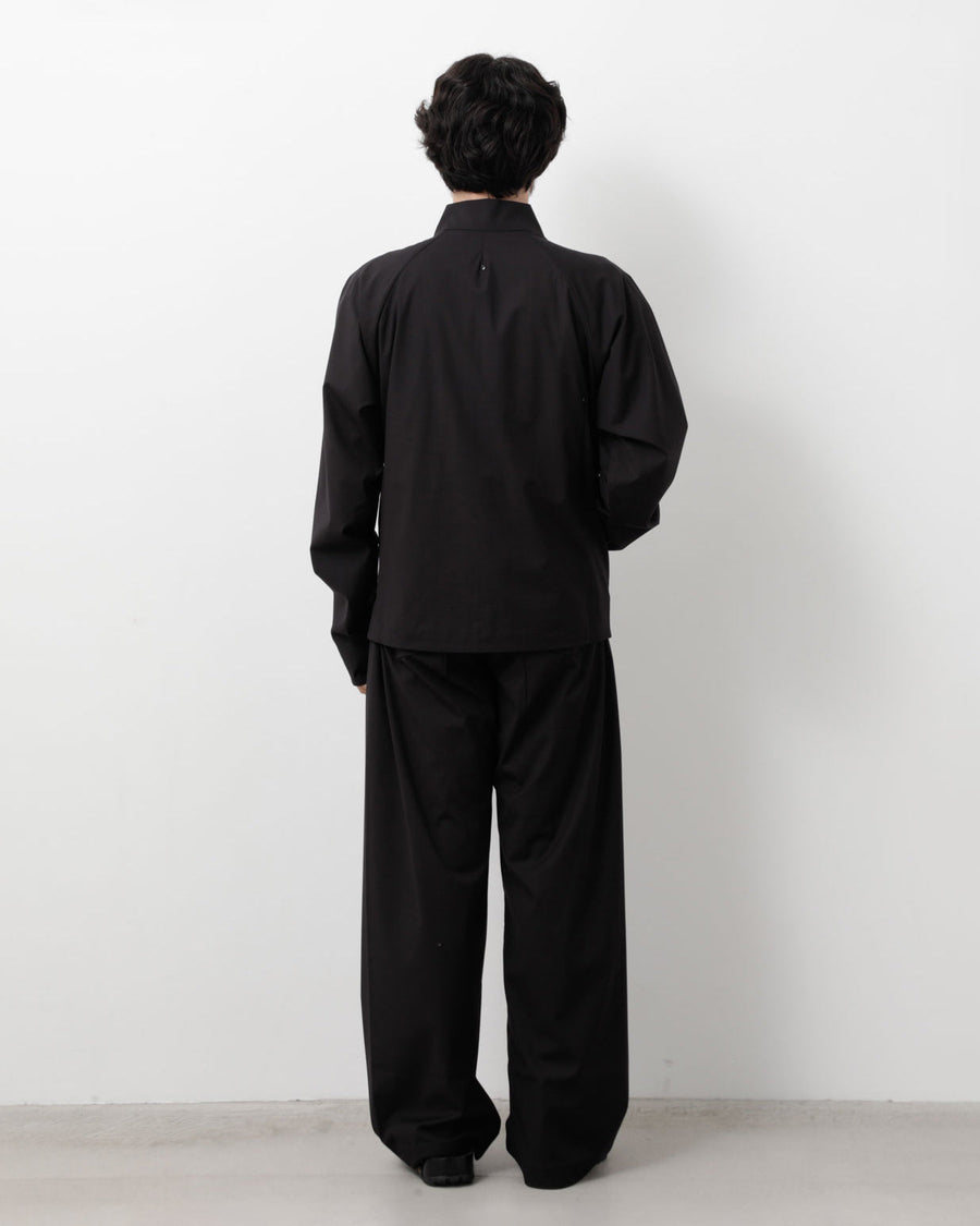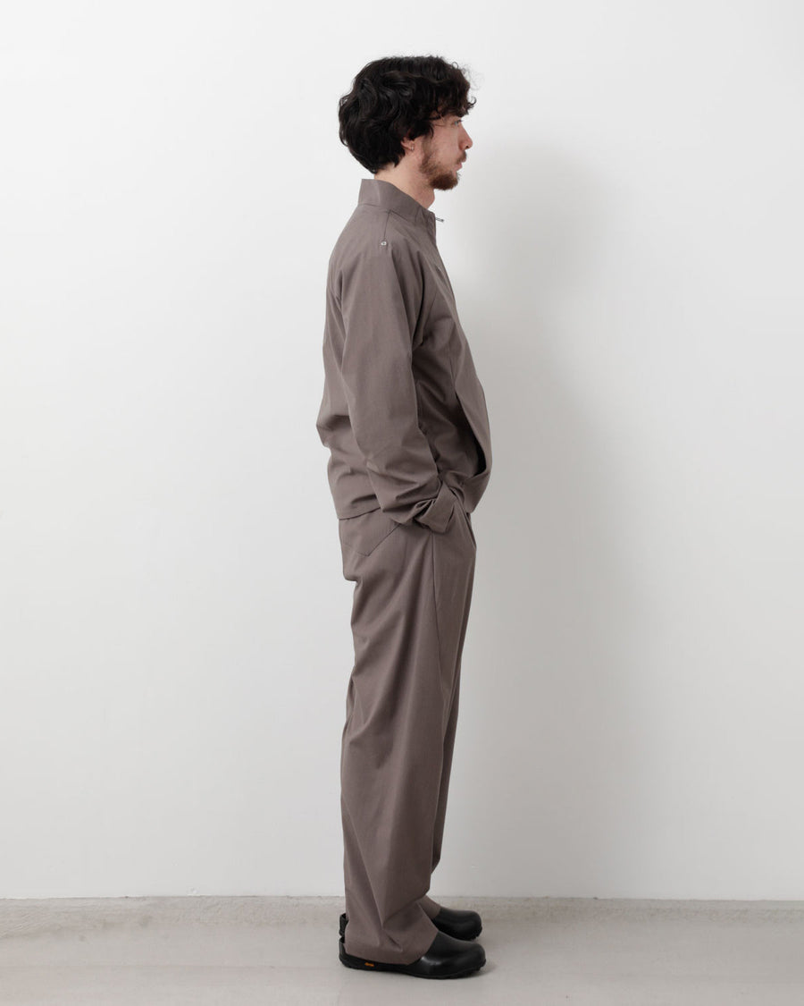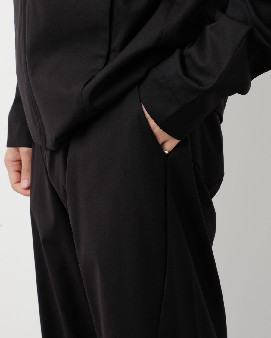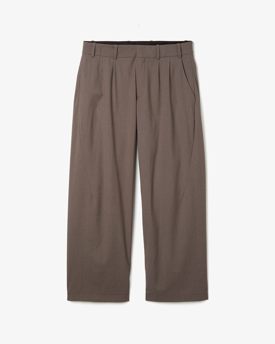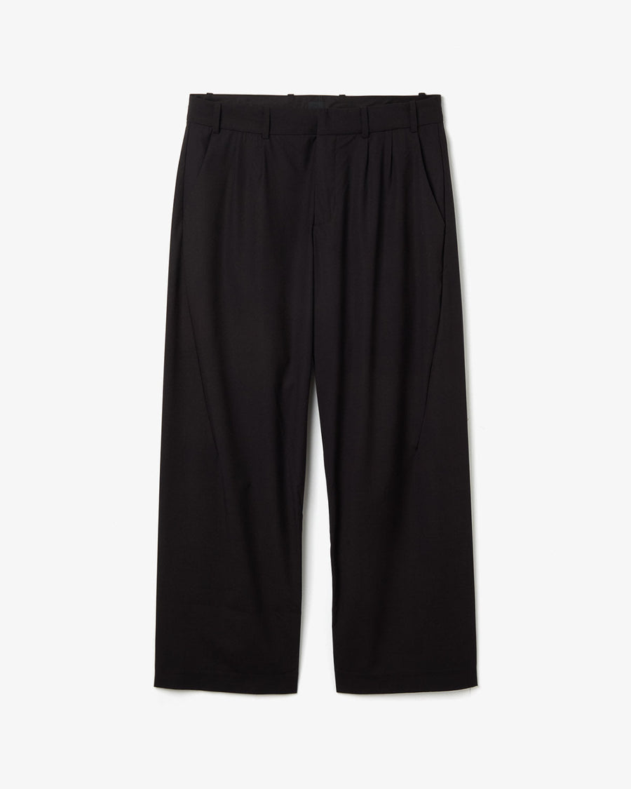 “GO TROUSERS” in a refined, shape-retaining polyester blend, featuring twin front pleats and a one-piece leg construction for a sculpted, dimensional silhouette.
