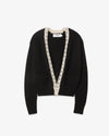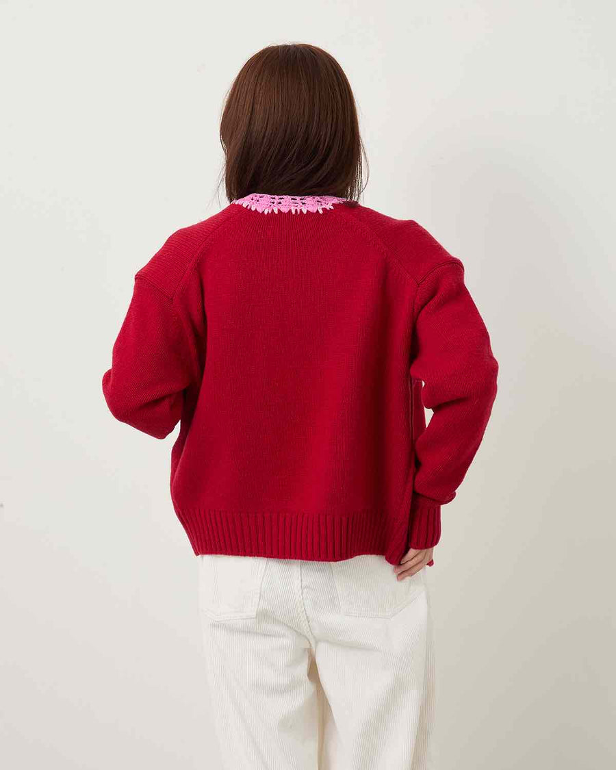 This jacket cardigan combines 5G machine-knit and hand-crocheted details in soft 19.5μ Australian merino lambswool, with detachable shoulder pads and a relaxed, buttonless design.