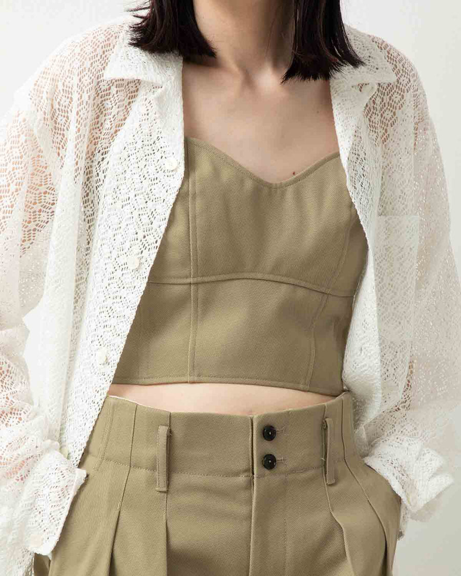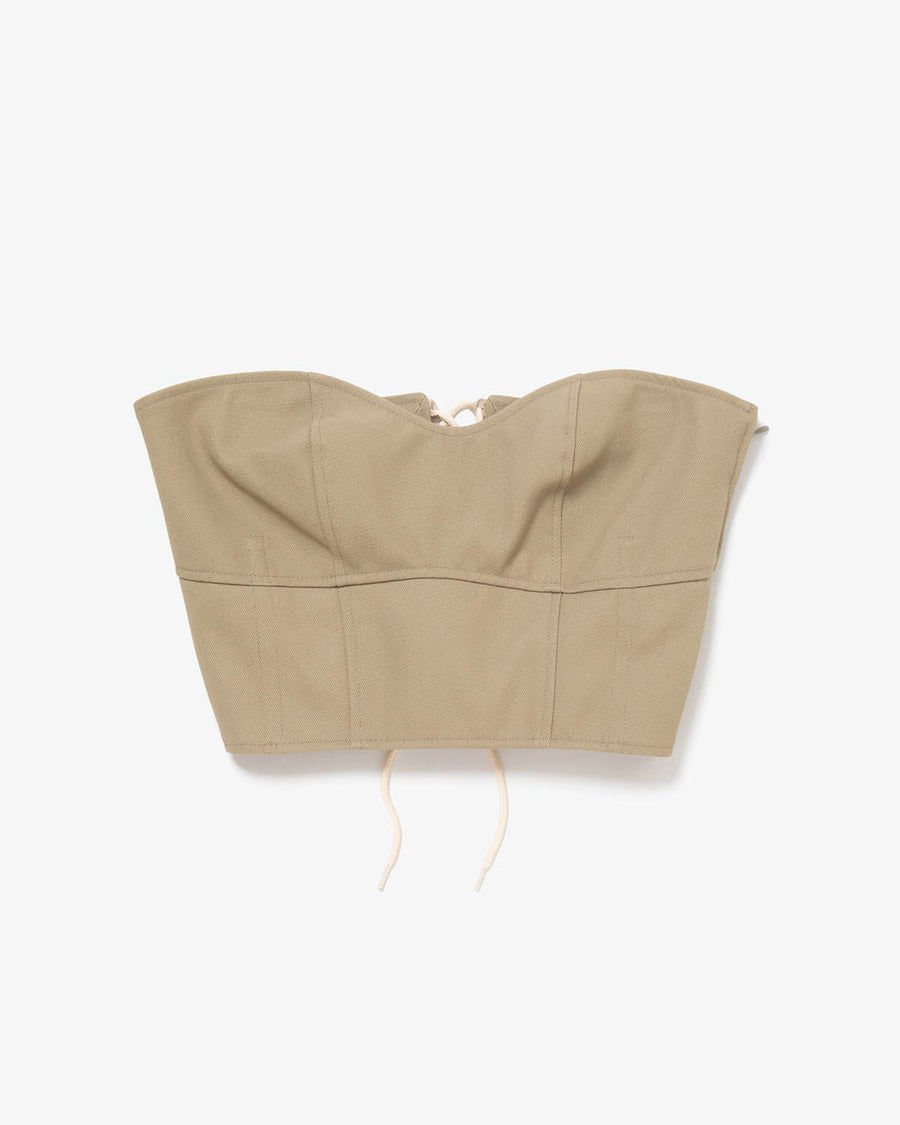 This bustier is made from high-density twill using strong twist yarn, offering a natural texture and wrinkle resistance. The back features a lace-up design with loop holes.