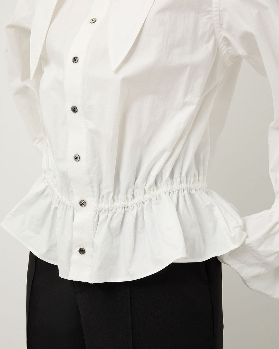 Blouse in Supima cotton satin with a kneaded finish for fine wrinkles and volume, featuring a stand collar with bow tie. Elastic at the cuffs and hem creates gathered flares.