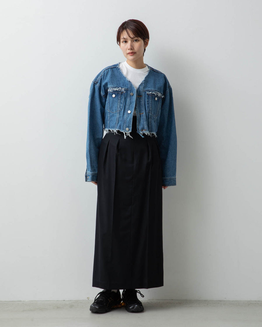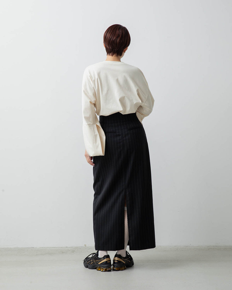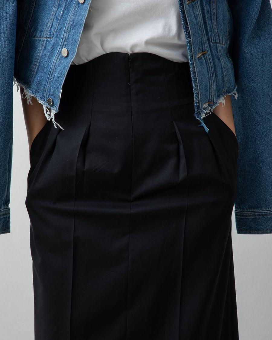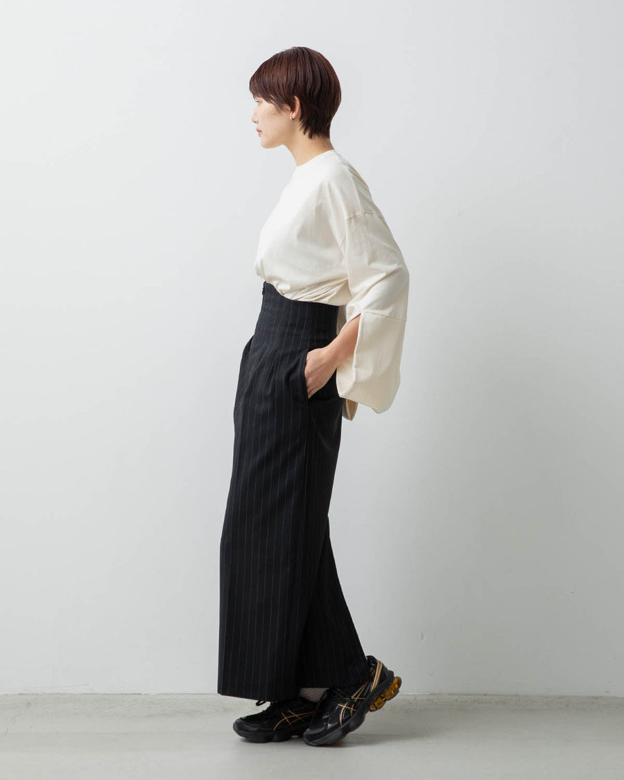 This high-waisted skirt uses Bishu wool, with a corset-inspired waist and double tucks for a relaxed fit around the hips.