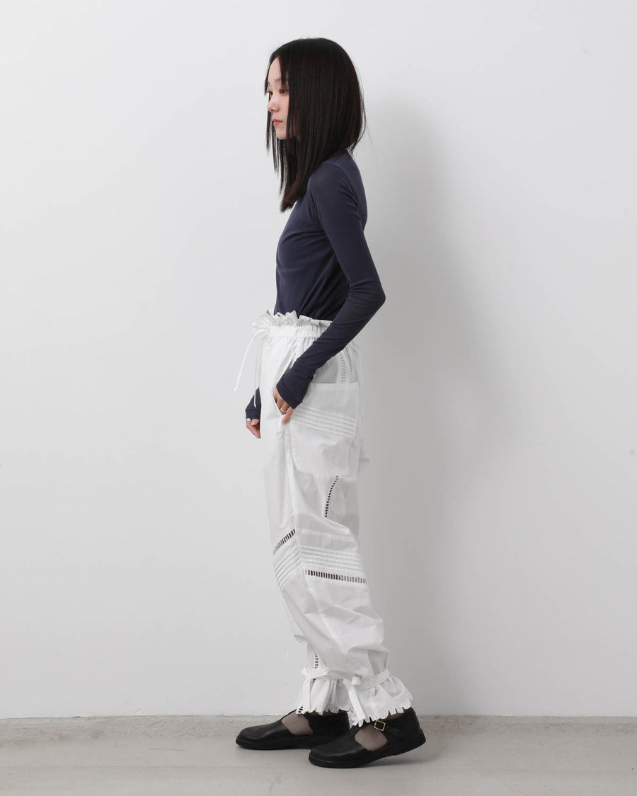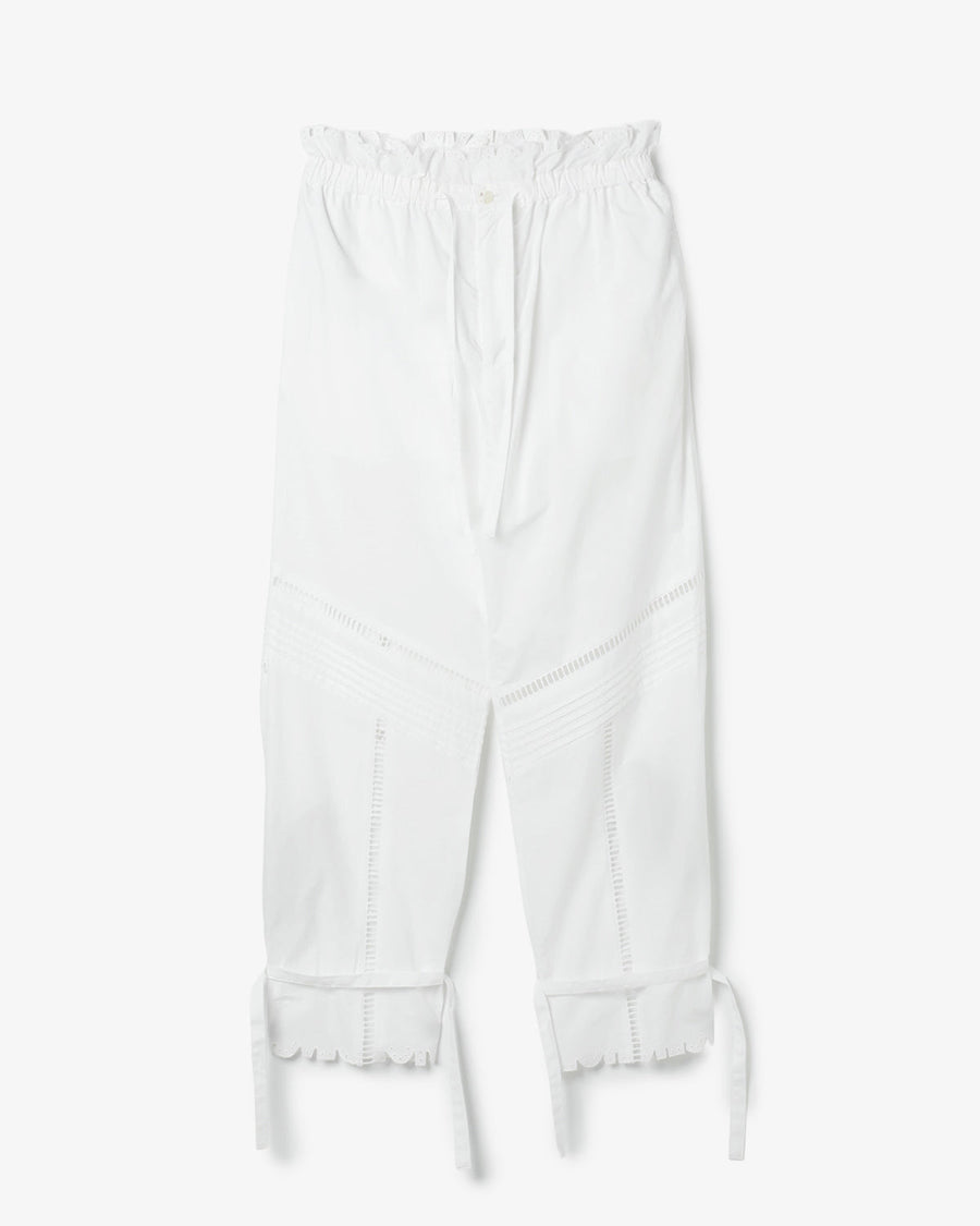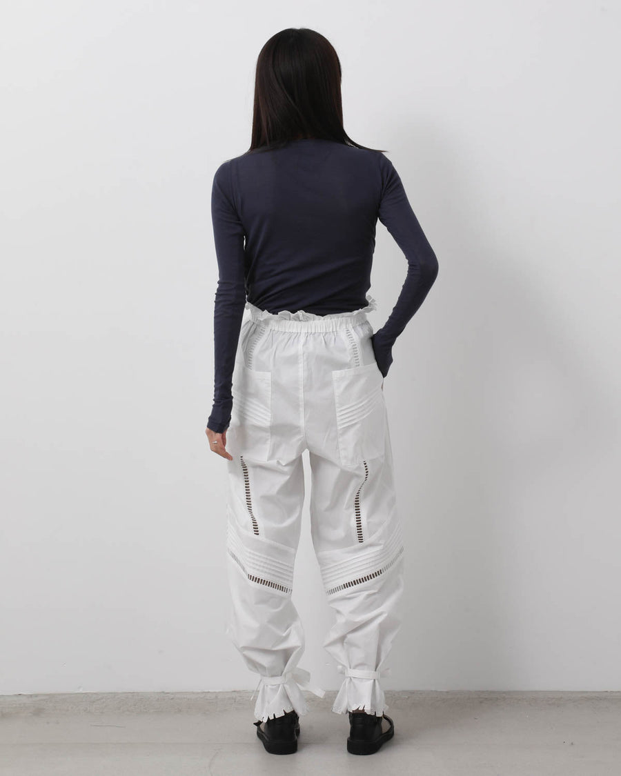 Crisp cotton trousers with a frilled elastic and drawstring waist, featuring ladder-lace cutouts from knee to hem for a light, refined look.