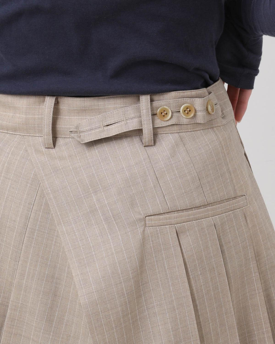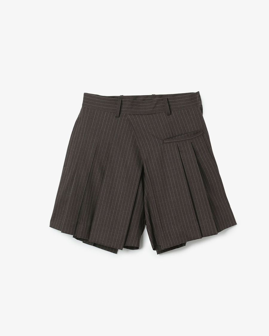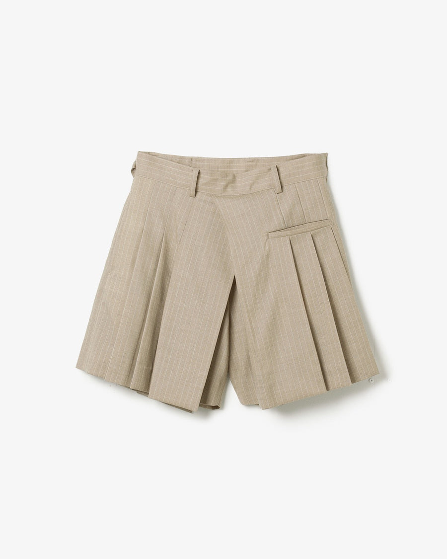 Summer wool shorts in a wool–nylon–polyurethane blend with cotton lining, featuring tucks and an asymmetric wrap-style design for a voluminous, dynamic silhouette.