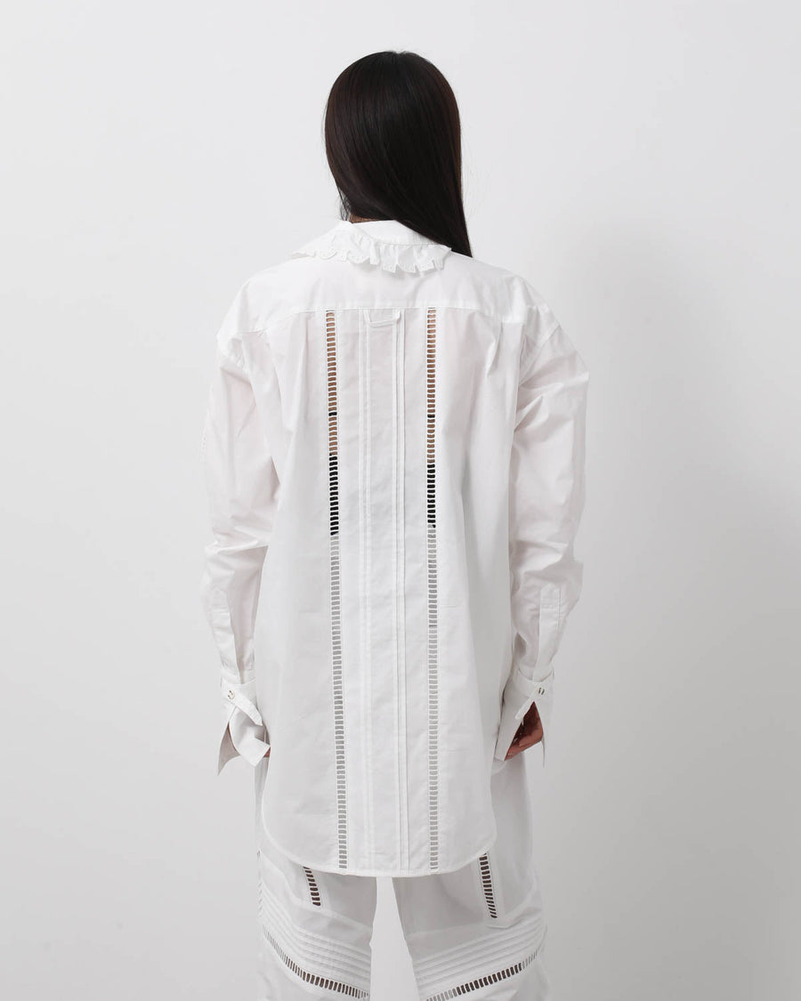 A crisp cotton blouse featuring eye-catching ruffle lace at the collar and an oversized silhouette for a relaxed yet refined look.