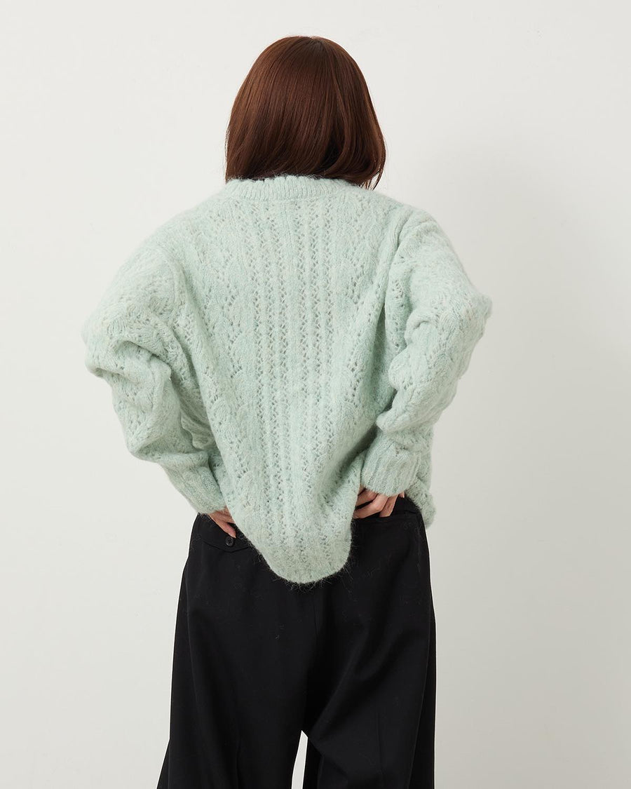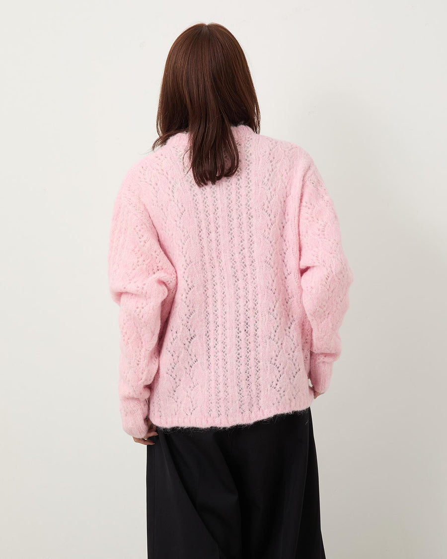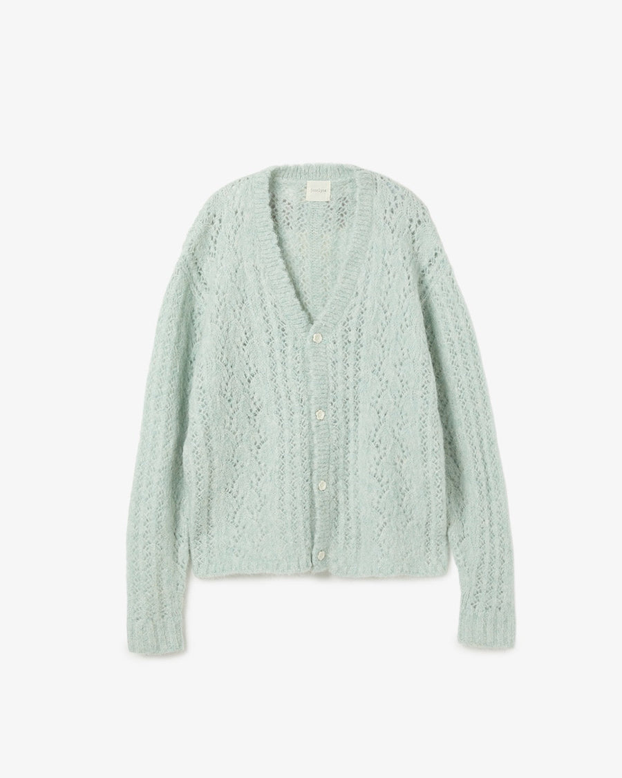 The MOHAIR SUKASHI KNIT CARDIGAN features delicate openwork and soft, hairy alpaca-blend yarn, offering a relaxed, lightweight silhouette perfect for refined autumn-winter layering.
