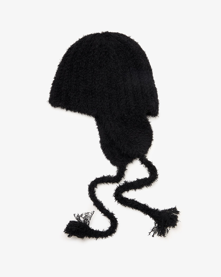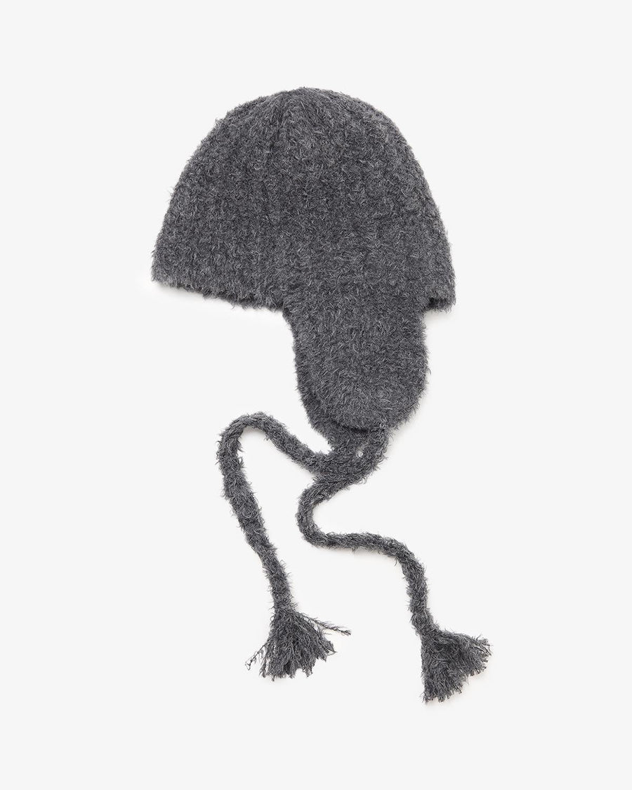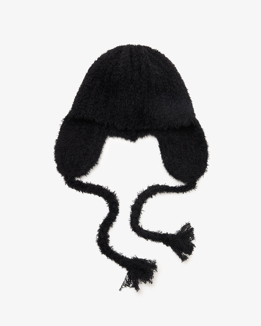 A furry knit beanie made from a blend of British wool and polyester, accented with matching yarn ear flaps featuring attached straps.