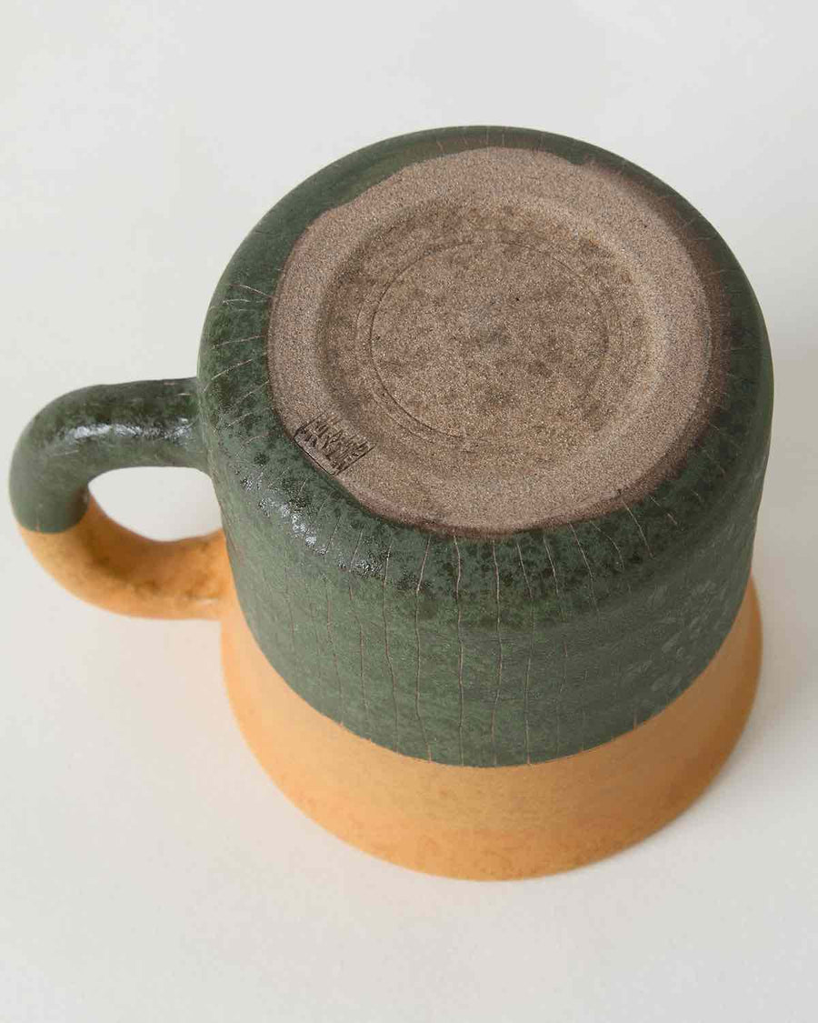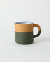 A two-tone mug with contrasting textures and a cozy, rounded shape, featuring a rare deep green color from Amakusa’s "green decoration."