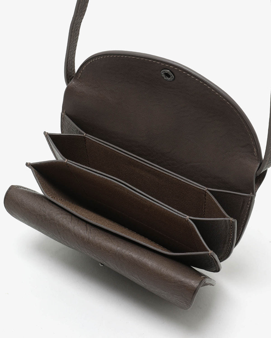 A round wallet in premium calf leather with a compact, expandable design.