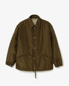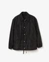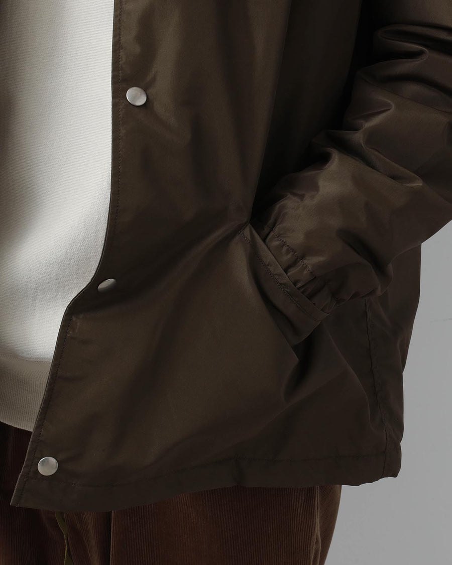 This coach jacket is crafted from high-density silk-poly weather fabric, combining luxurious silk sheen with structured body and resilience.