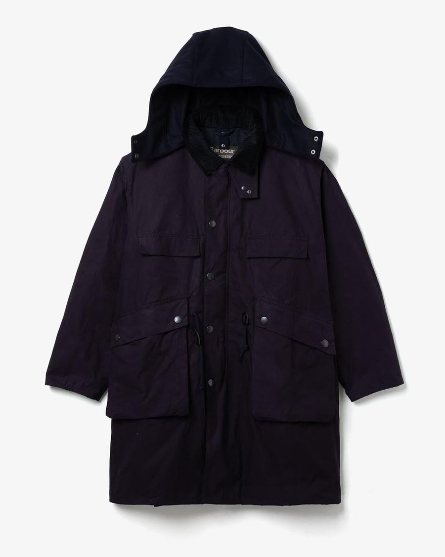 Barbour and KAPTAIN SUNSHINE debut a 6-item collection, including the oversized Field Coat with a detachable melton hood, crafted from co-developed dry wax cotton for a functional, adventurous design.