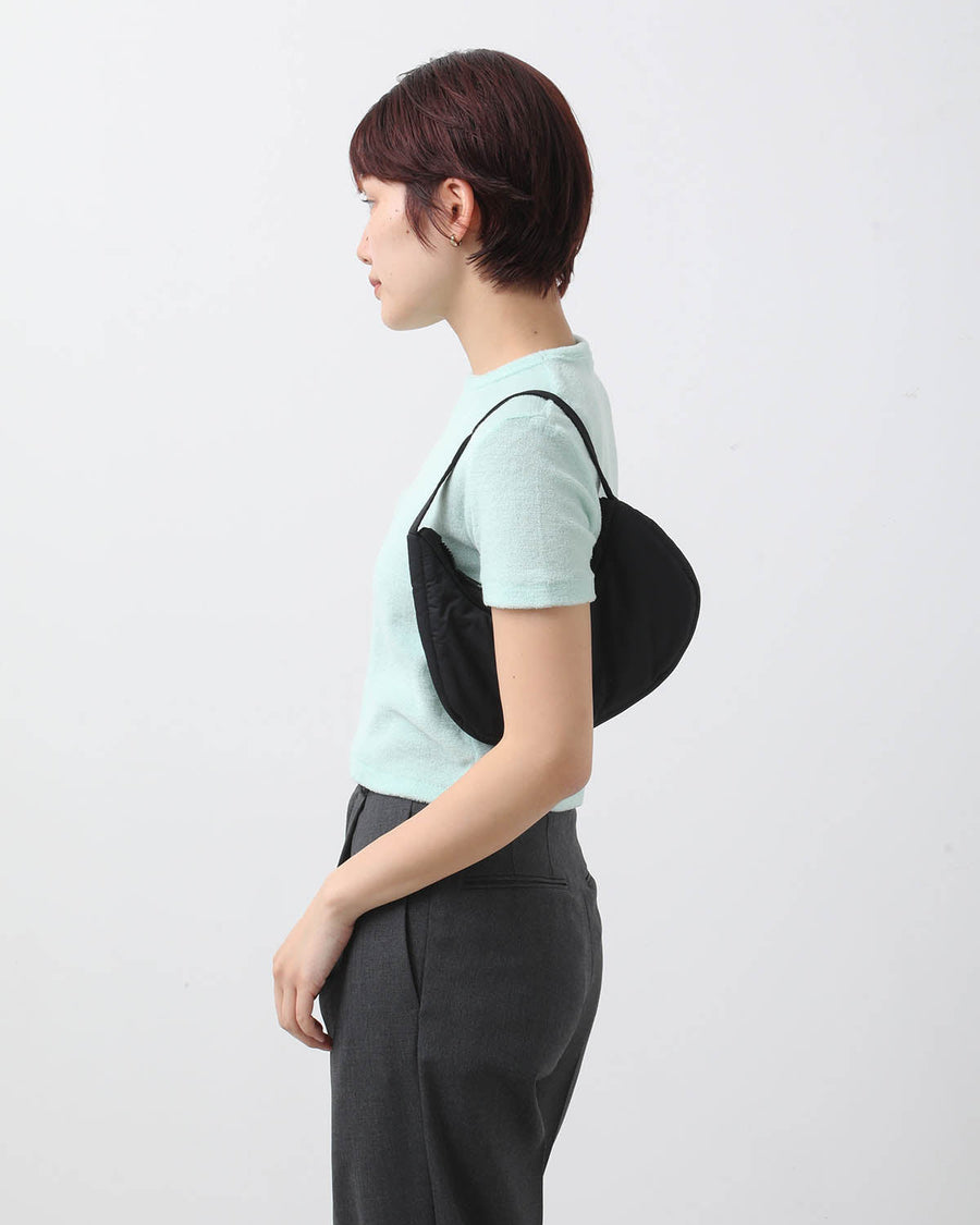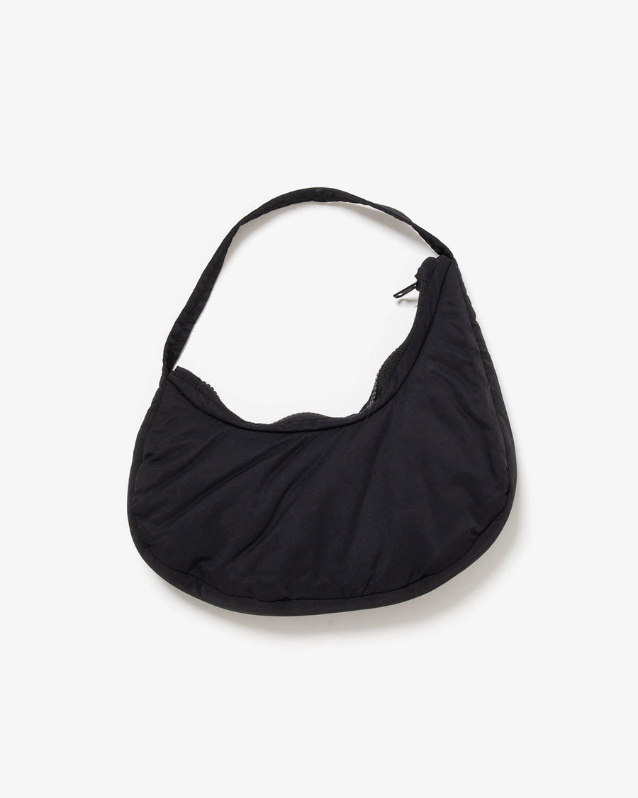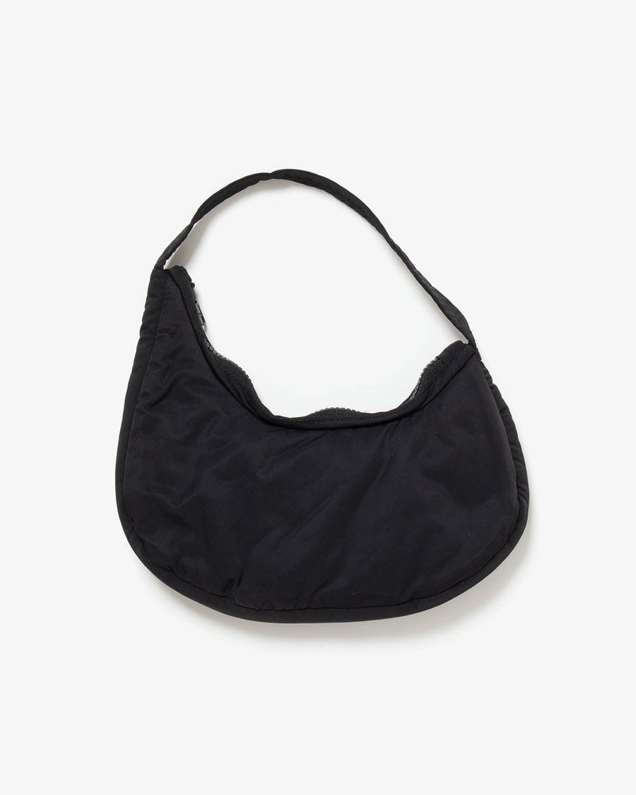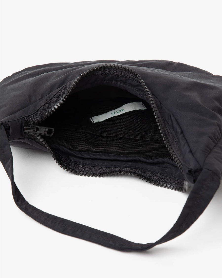A recycled nylon shoulder bag with stretch, smooth texture, and an asymmetrical rounded compartment.
