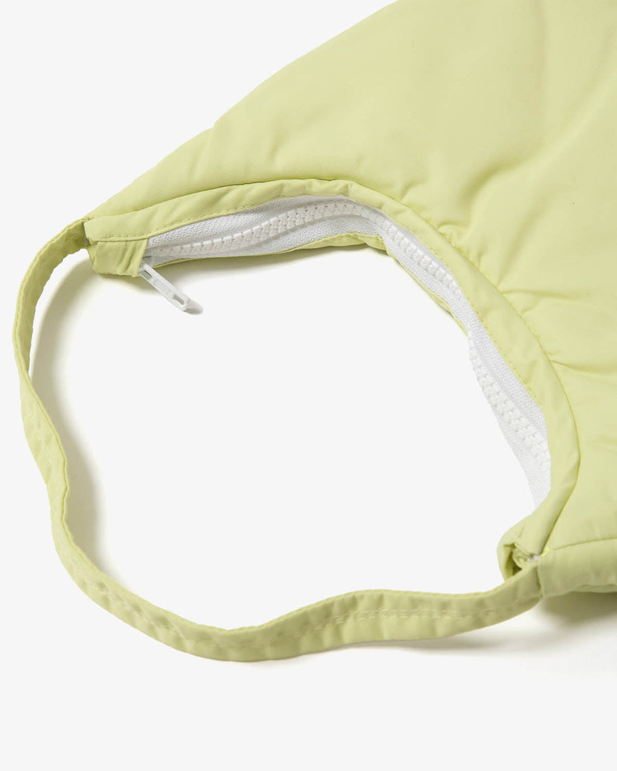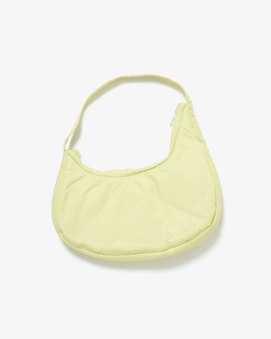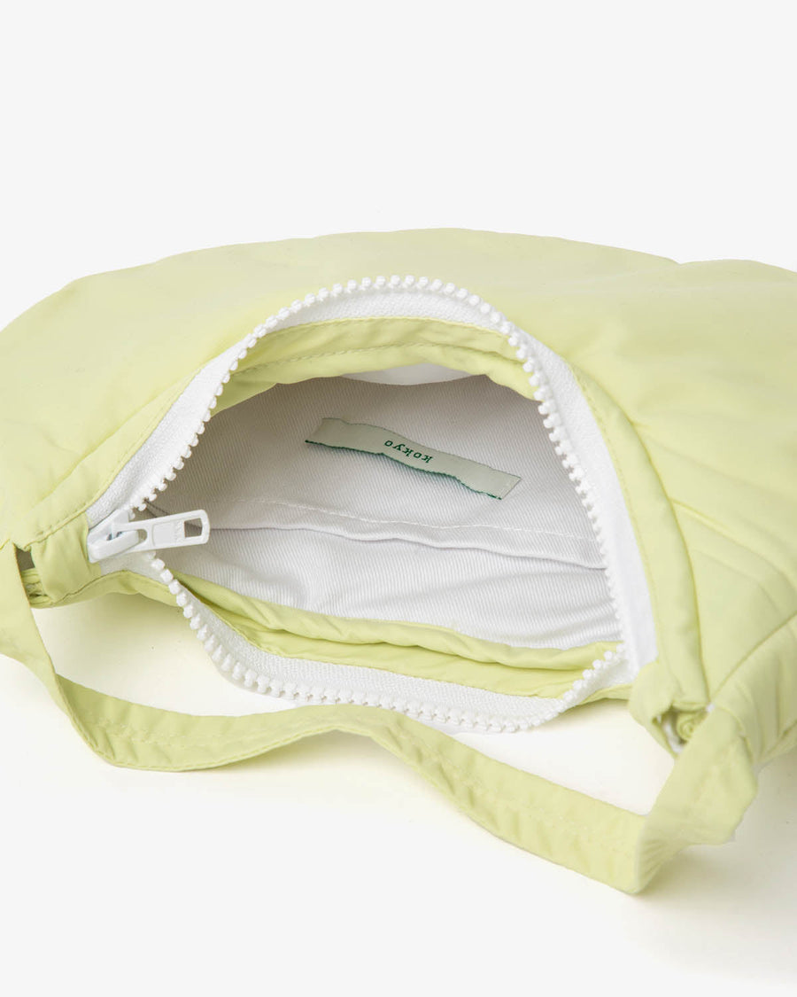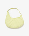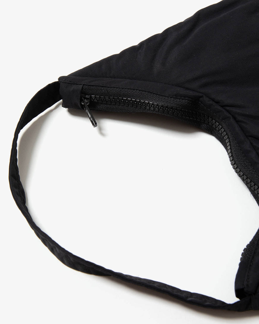 A recycled nylon shoulder bag with stretch, smooth texture, and an asymmetrical rounded compartment.